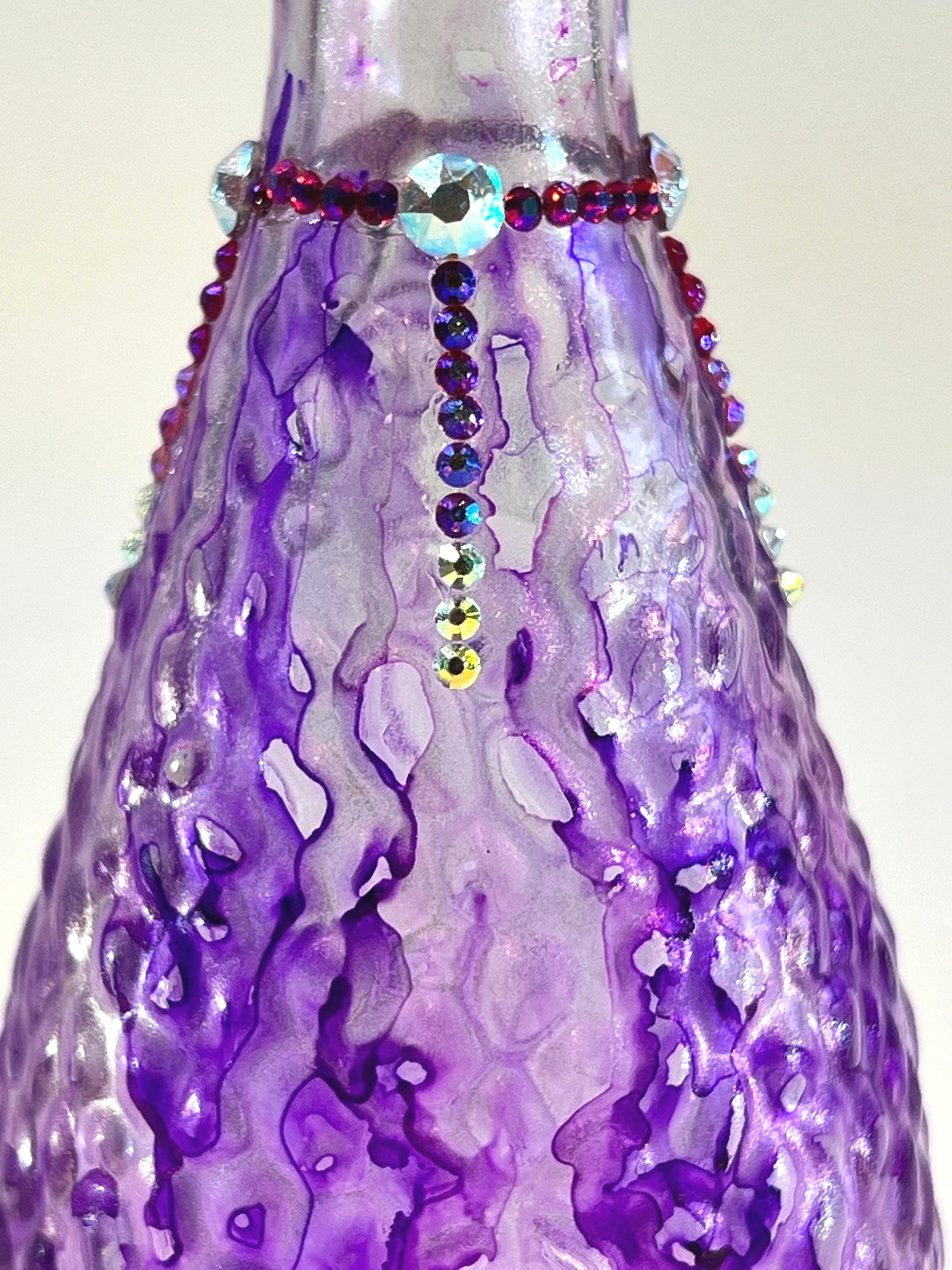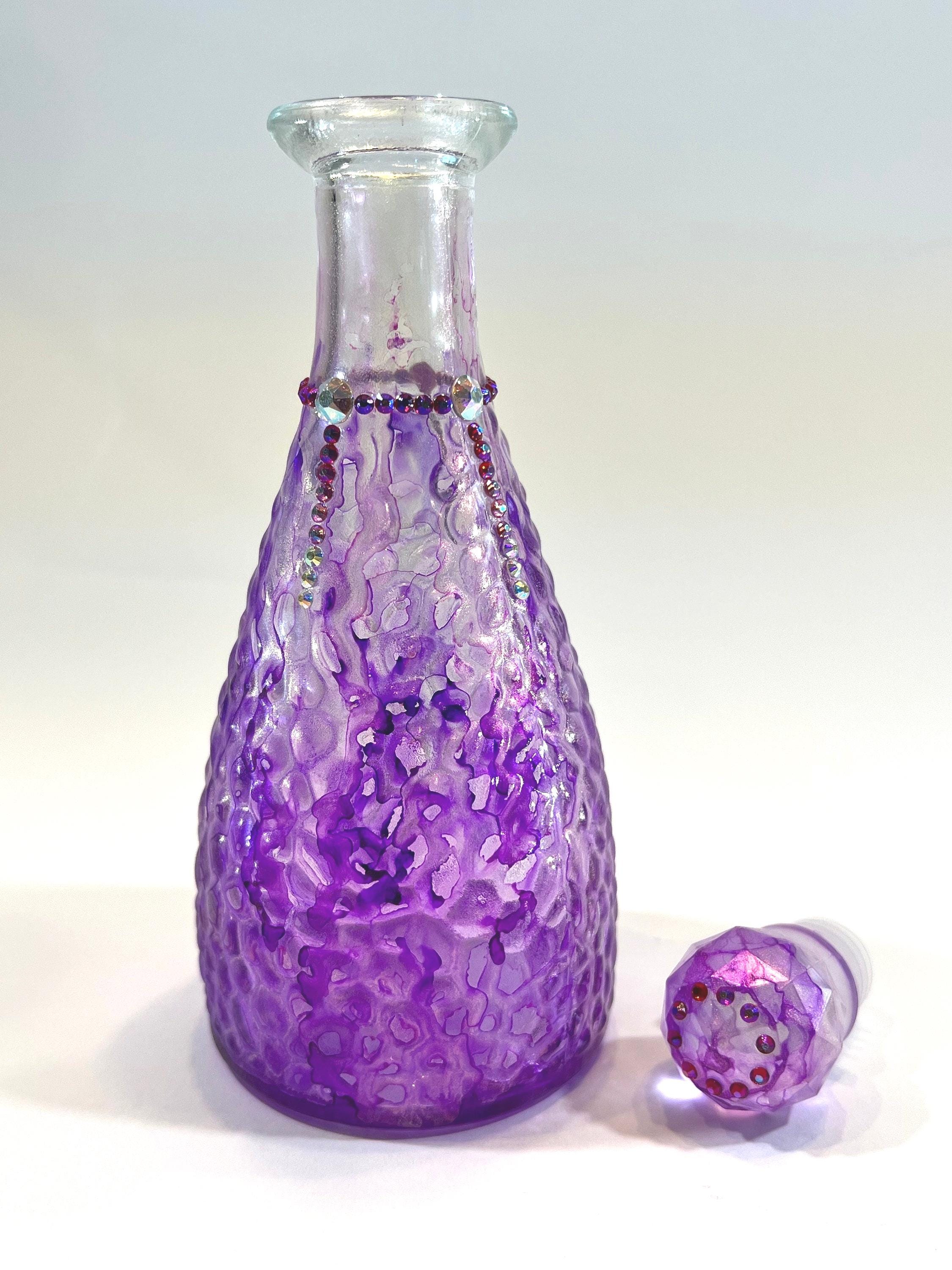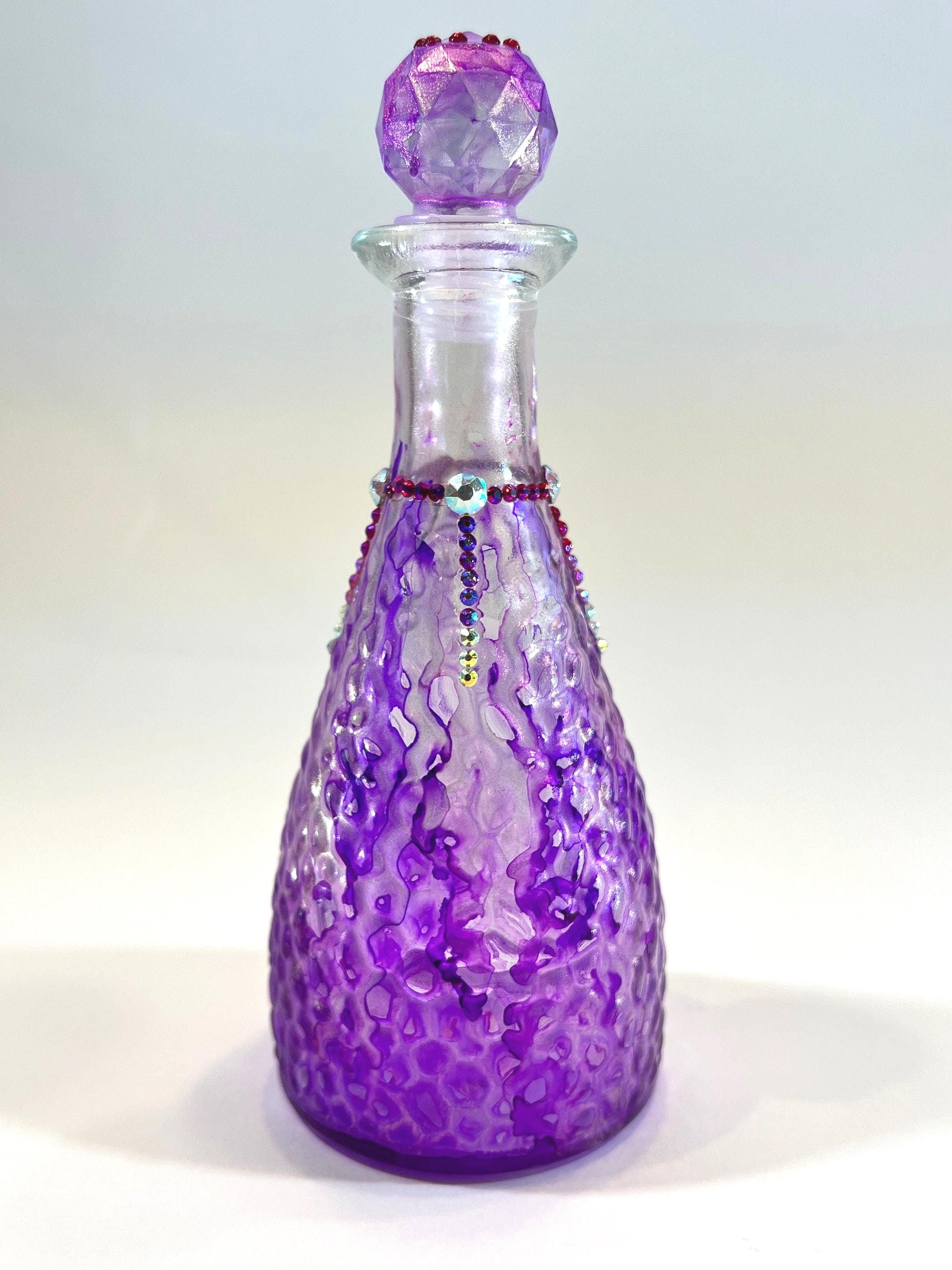 For the girl who loves purple and for those of us who still have princess dreams, this purple glass perfume bottle is hand-painted and bejeweled with crystals. Approximately 7 inches tall with stopper. Makes a lovely gift or a unique addition to your decor. Ink and crystals on glass. All artworks are one-of-a-kind, signed by the artist, and come with a Certificate of Authenticity.