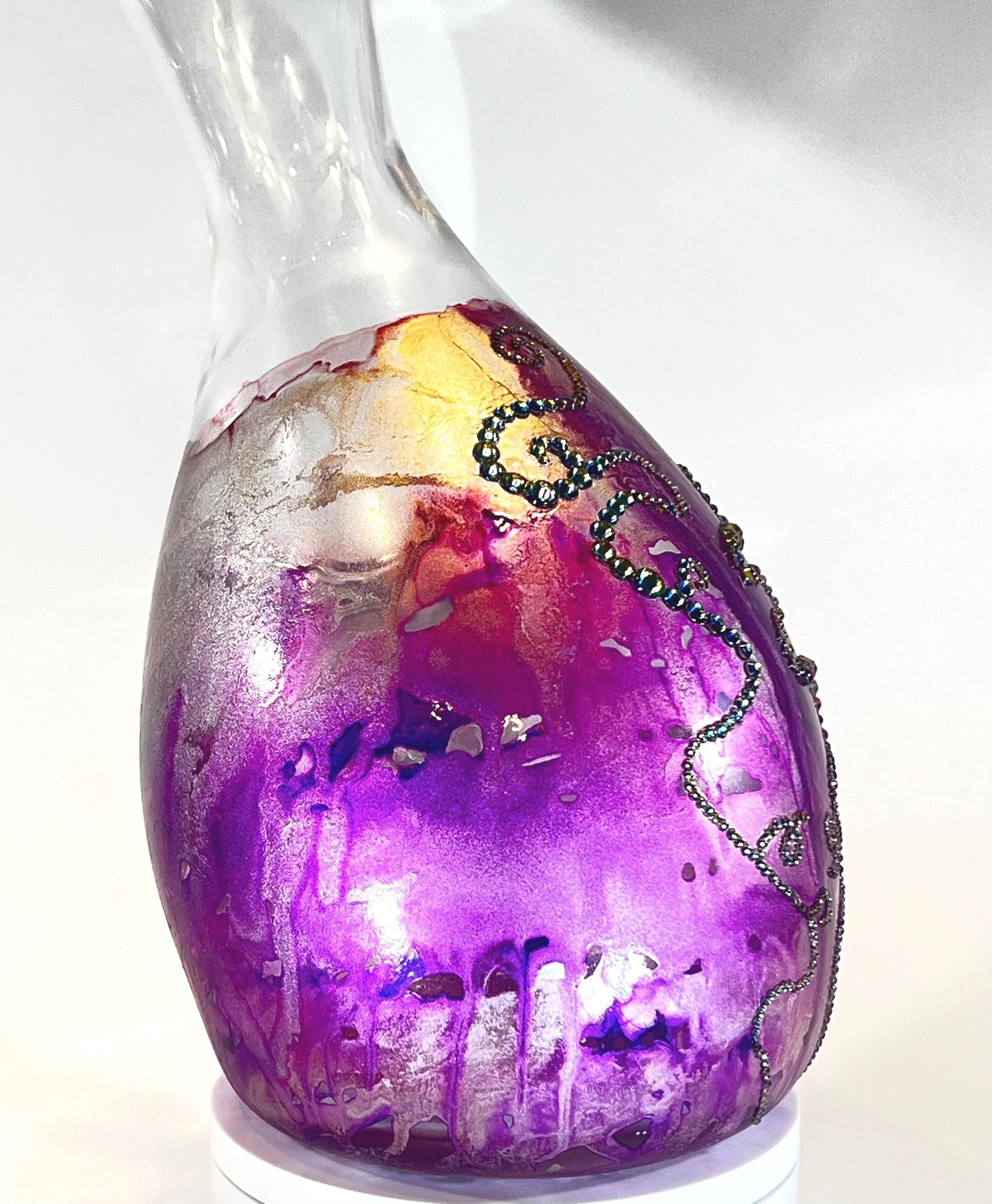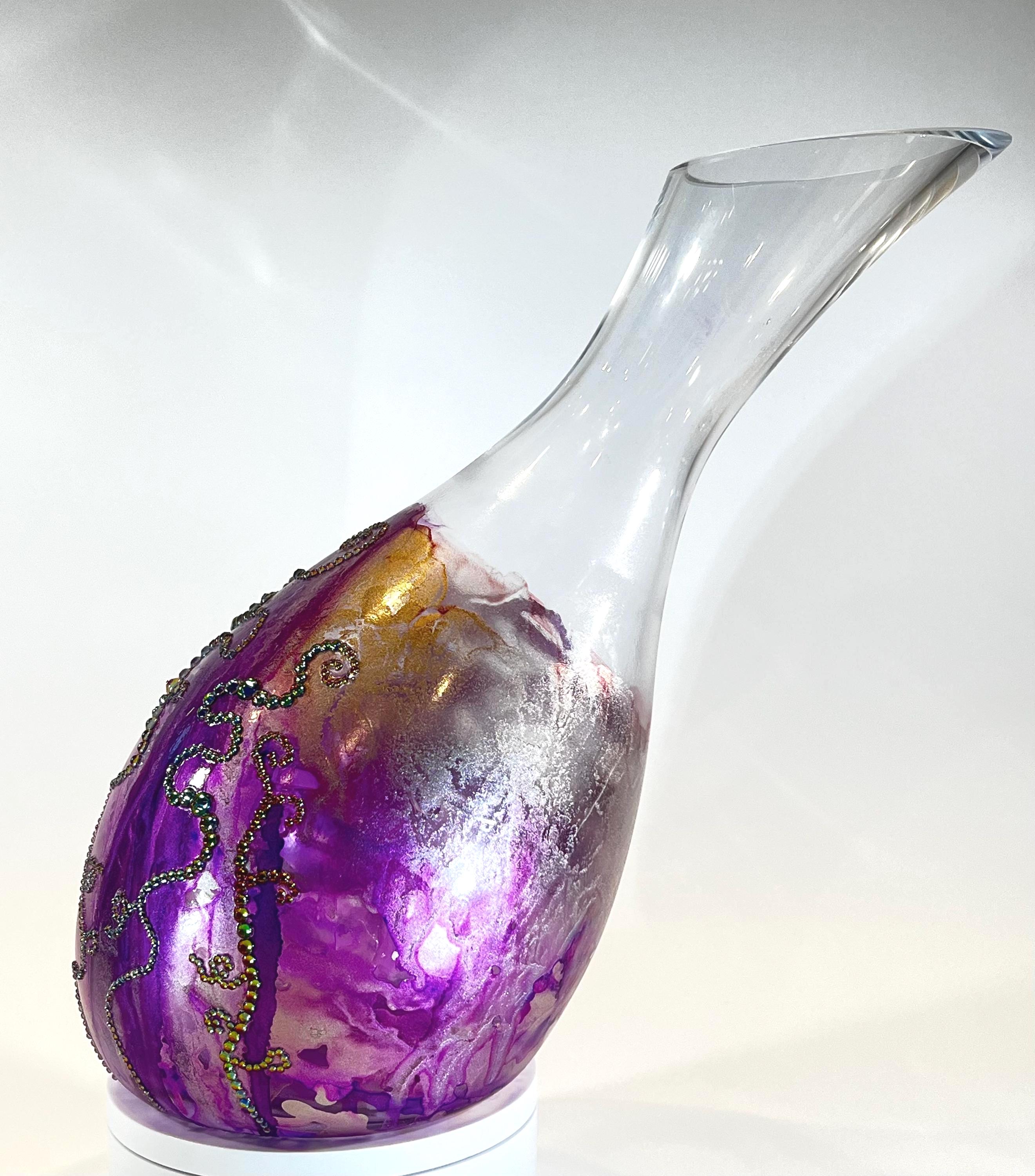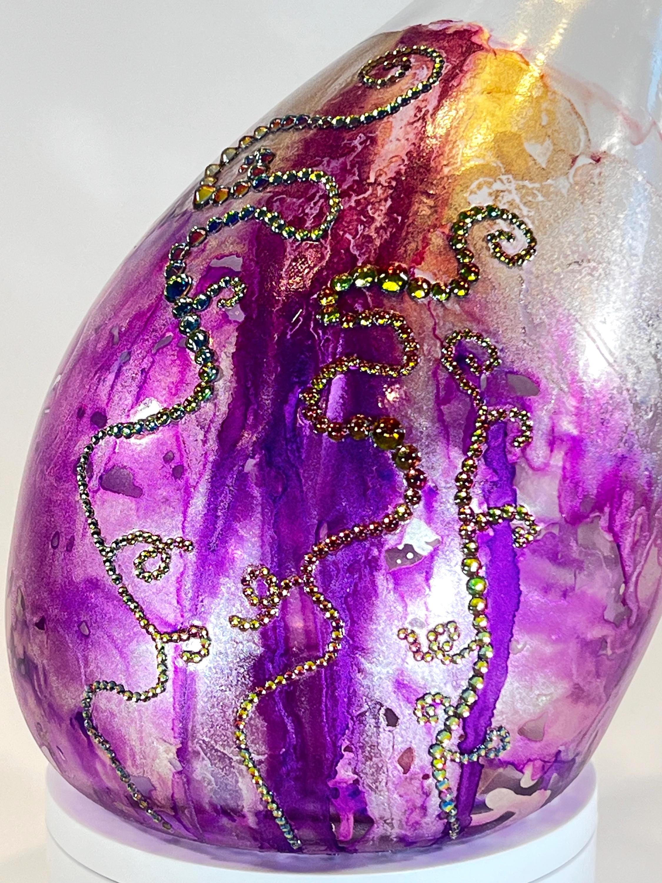 This vintage “gooseneck” glass wine decanter is fully functional and painted in shades of purple and rose gold with vitrail crystals. The crystal design is evocative of Dr. Seuss! Approximately 10" tall. Ink and crystals on glass. All artworks are one-of-a-kind, signed by the artist, and come with a Certificate of Authenticity.