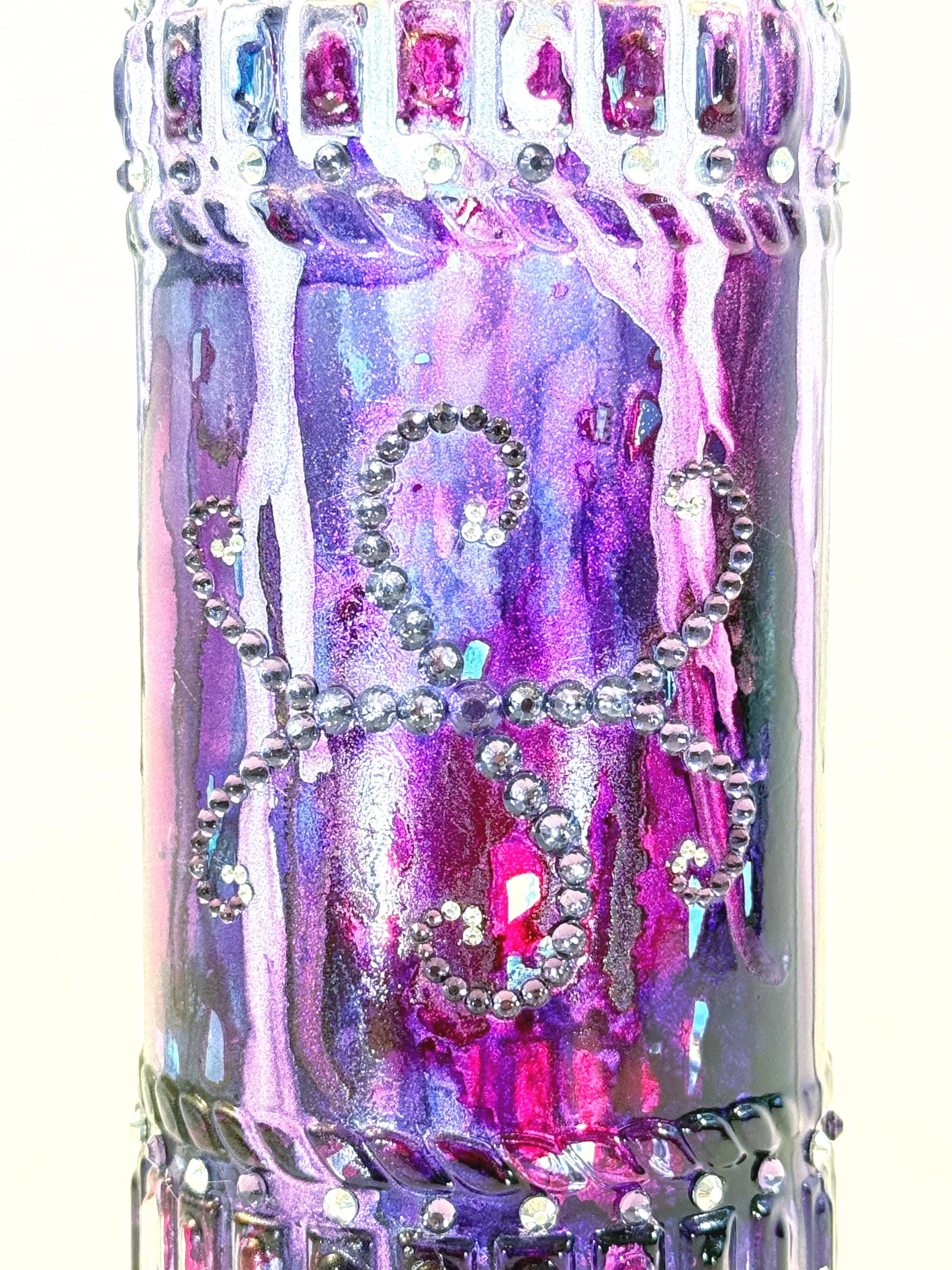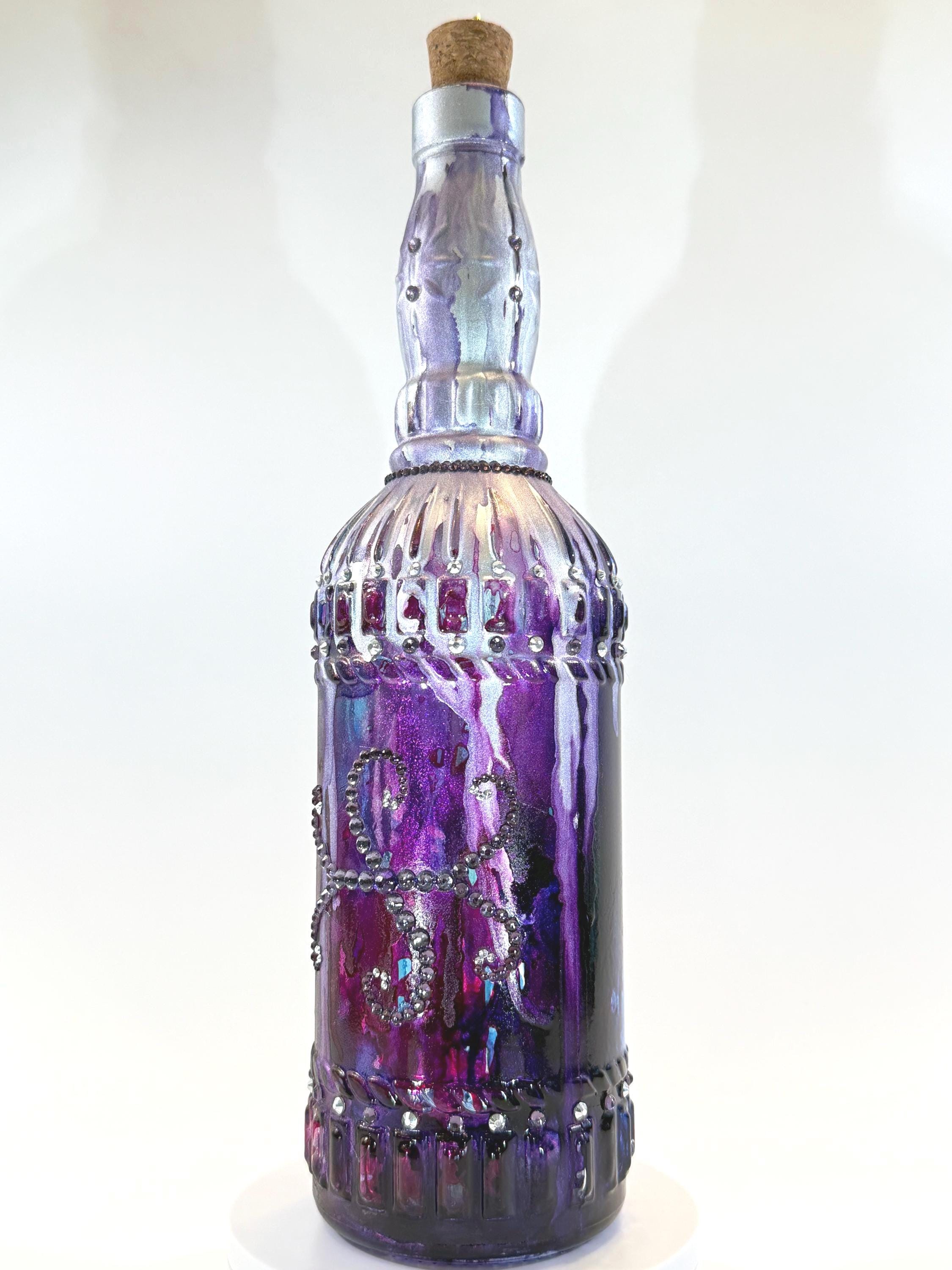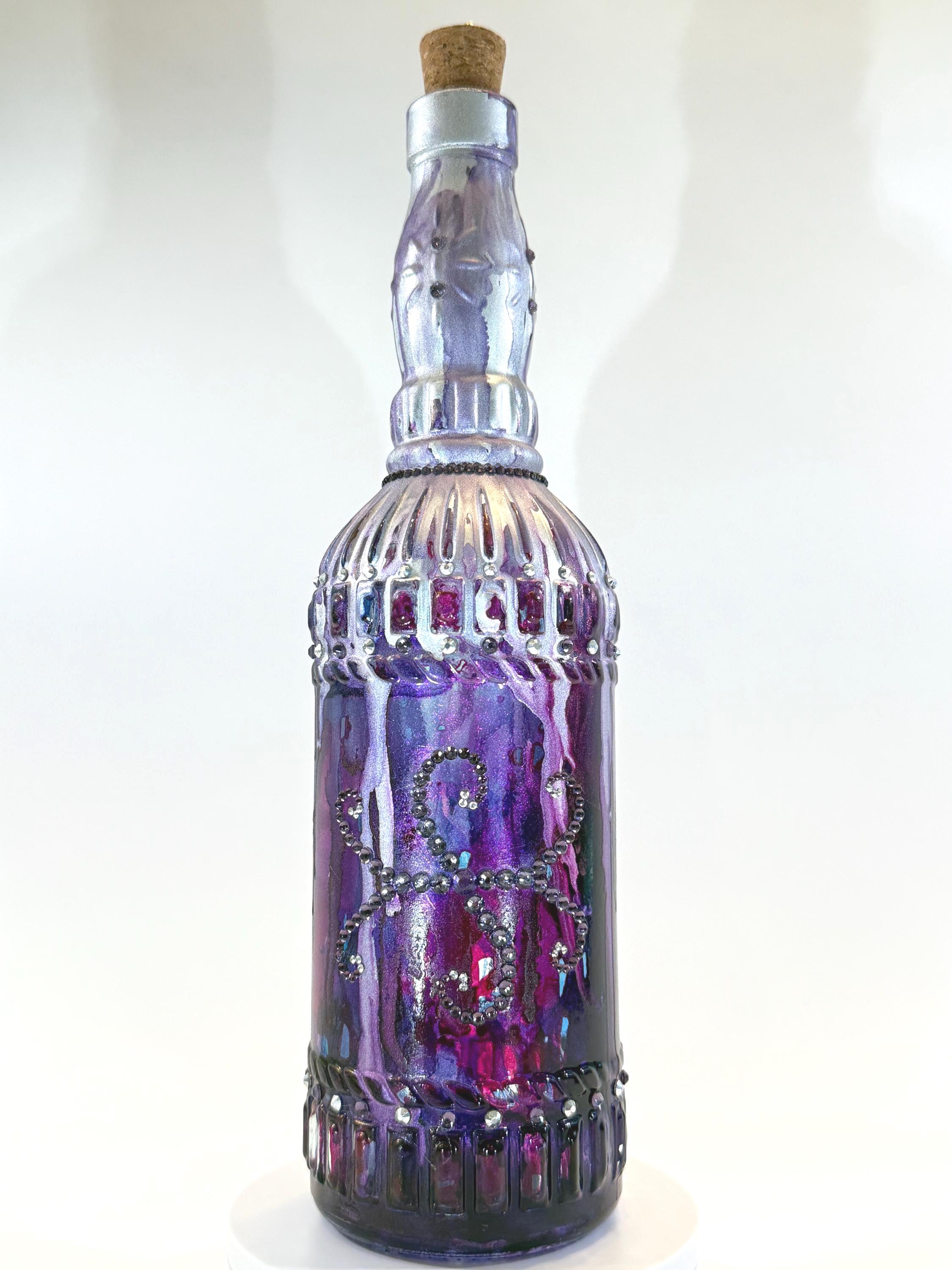This bottle evokes the dark beauty of "Game of Thrones" and is painted in shades of deep purple and silver with a fascinating serpentine crystal design on the front. It makes a beautiful stand-alone art piece or can be part of a collection. Approximately 12" tall with cork. Ink and crystals on glass. All artworks are one-of-a-kind, signed by the artist, and come with a Certificate of Authenticity.