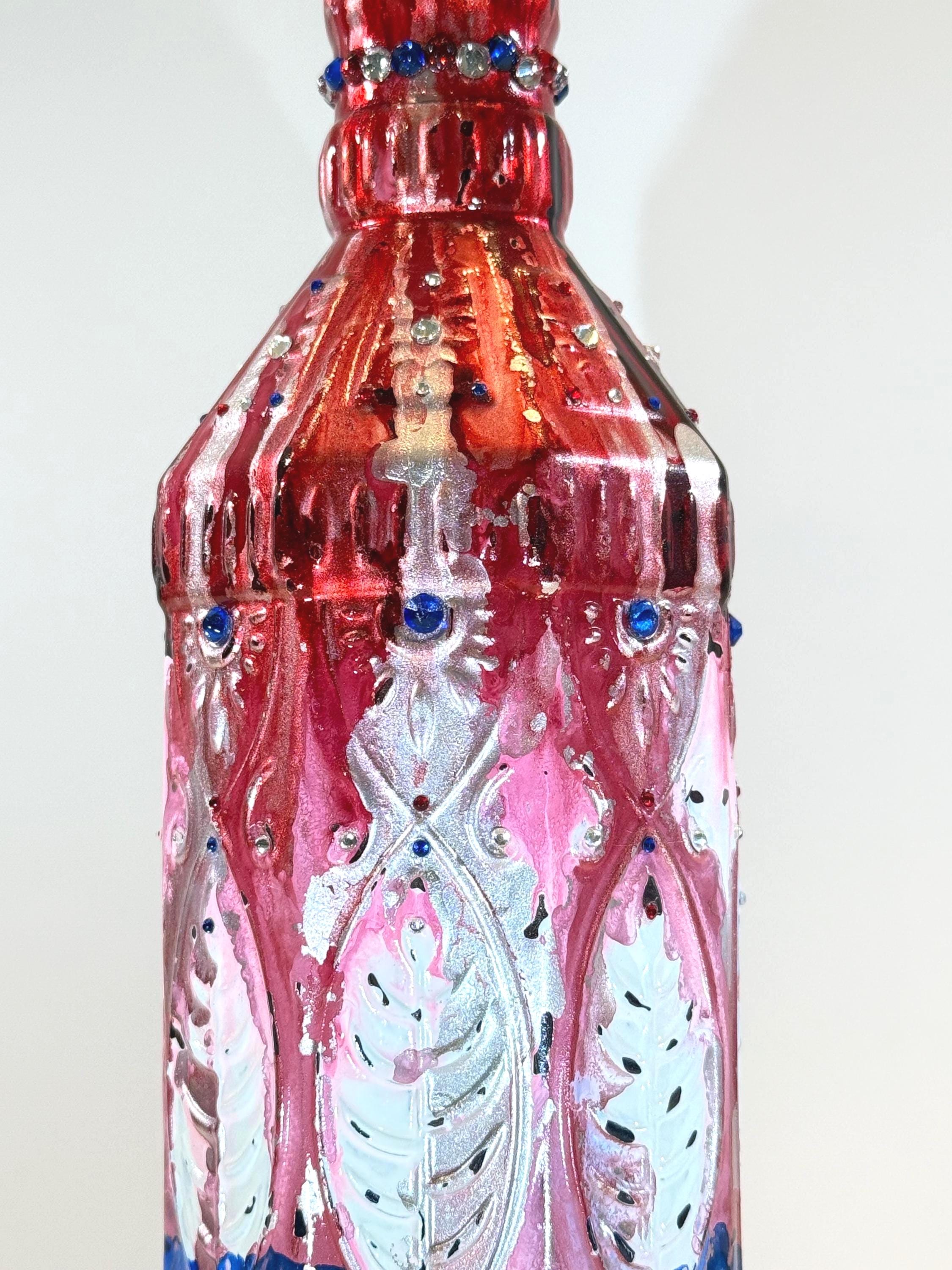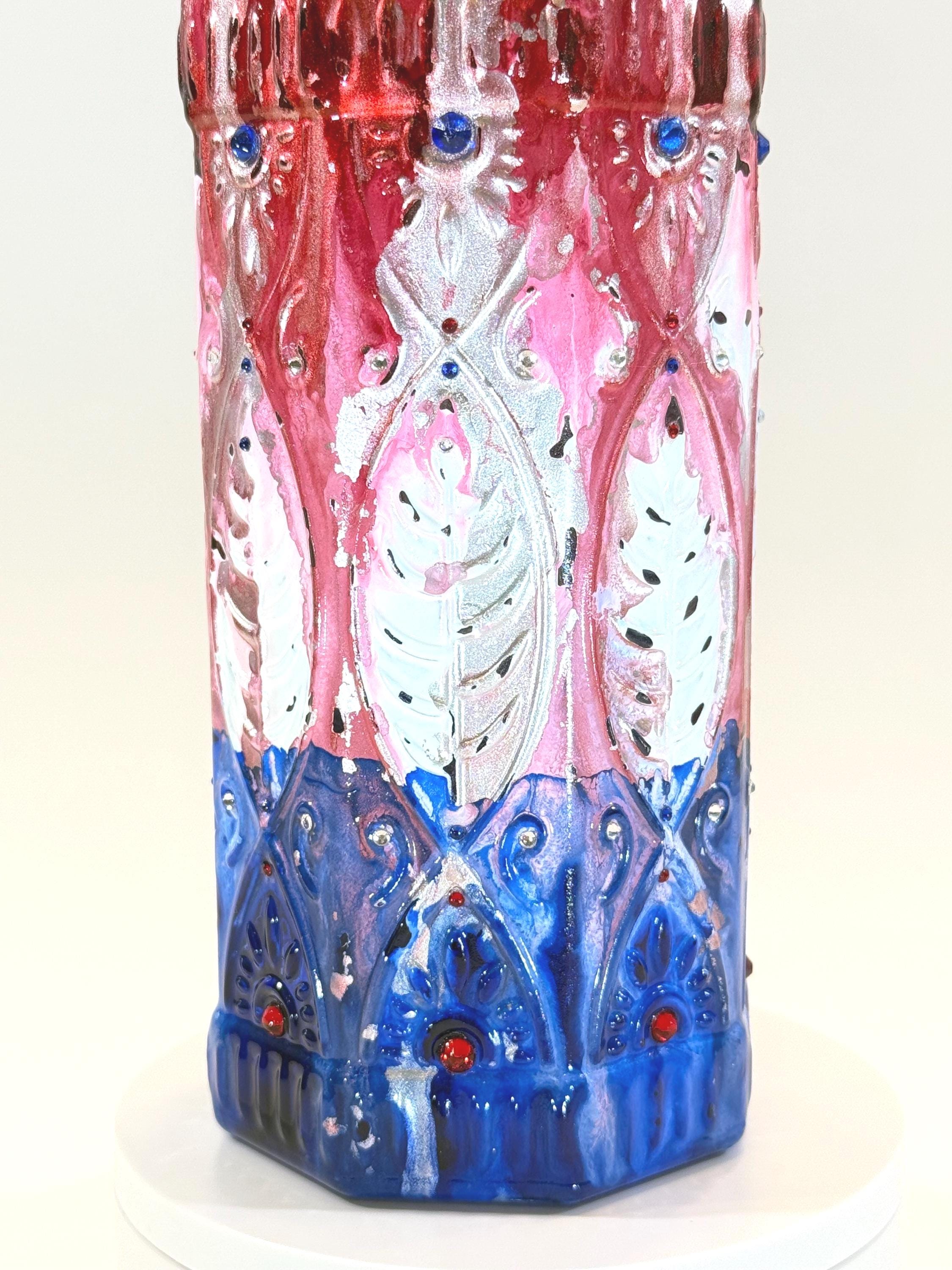 Long may it wave! Our Independence Day hand-painted Italian glass bottle is inspired by Old Glory and is perfect for your Fourth of July display or a gift for the flag decor collector. Approximately 12" tall with cork. Ink and crystals on glass. All artworks are one-of-a-kind, signed by the artist, and come with a Certificate of Authenticity.