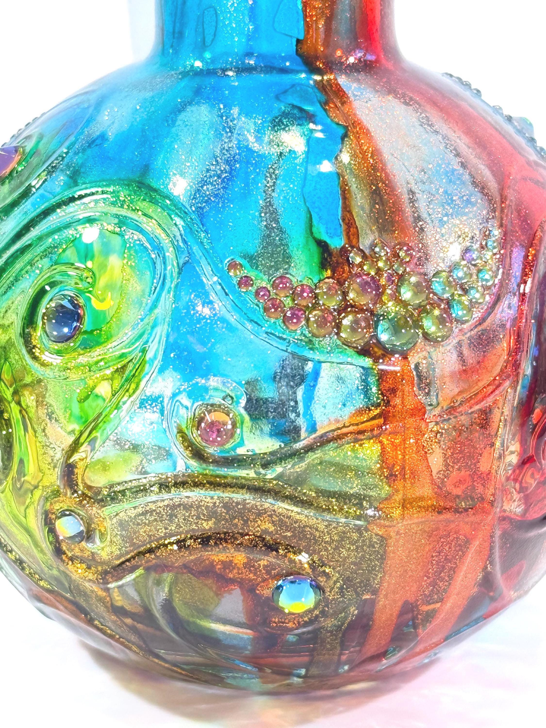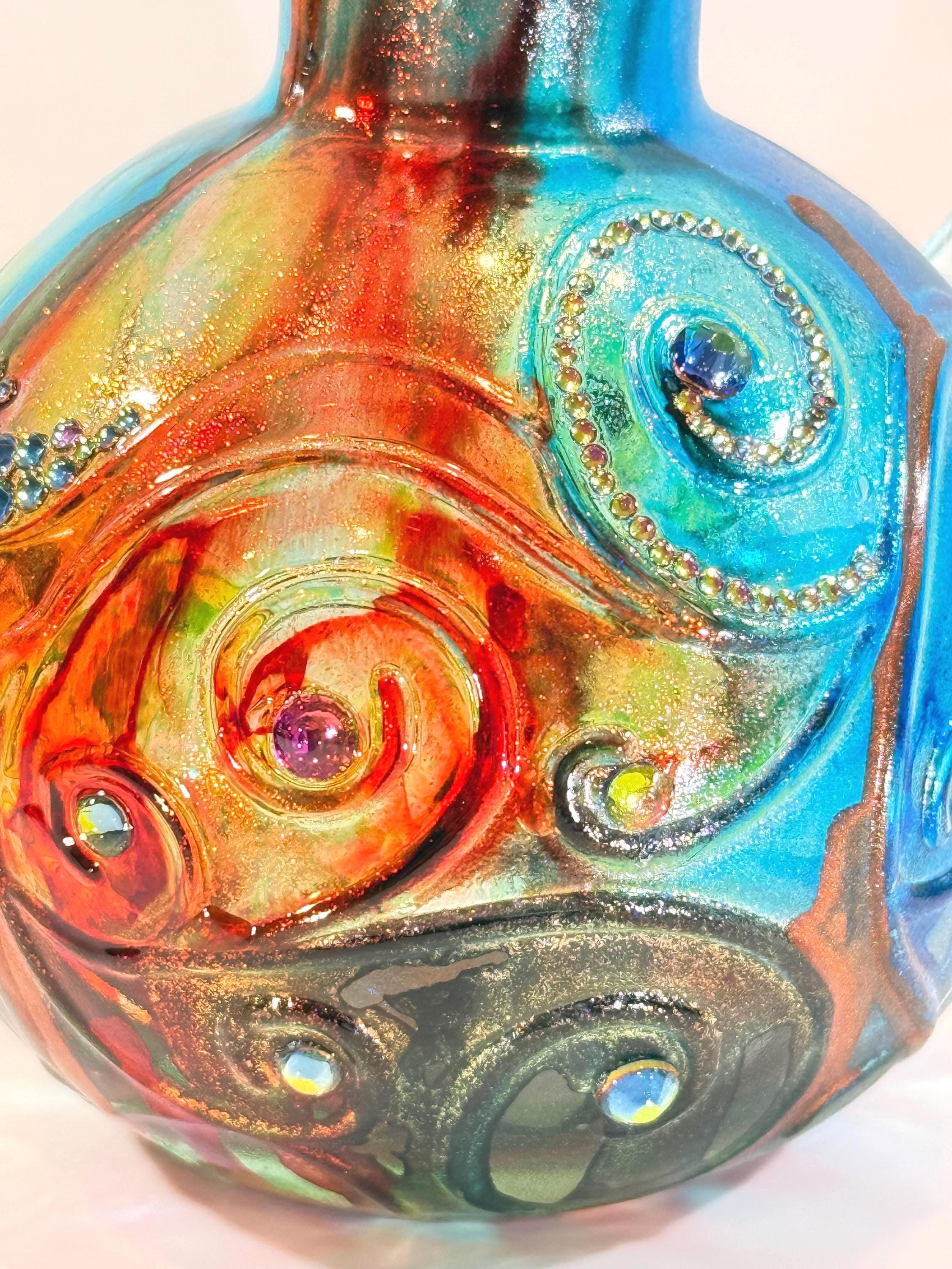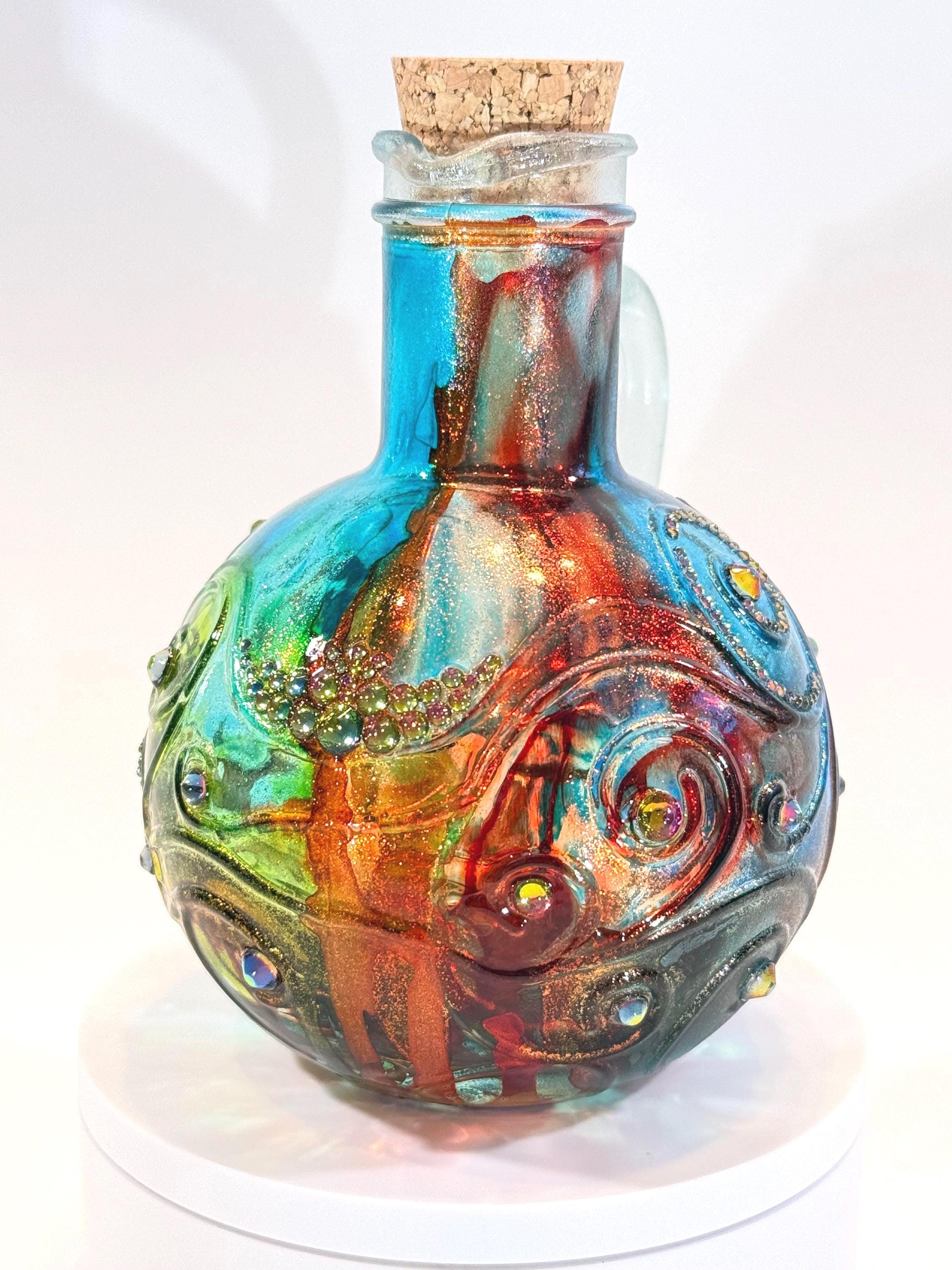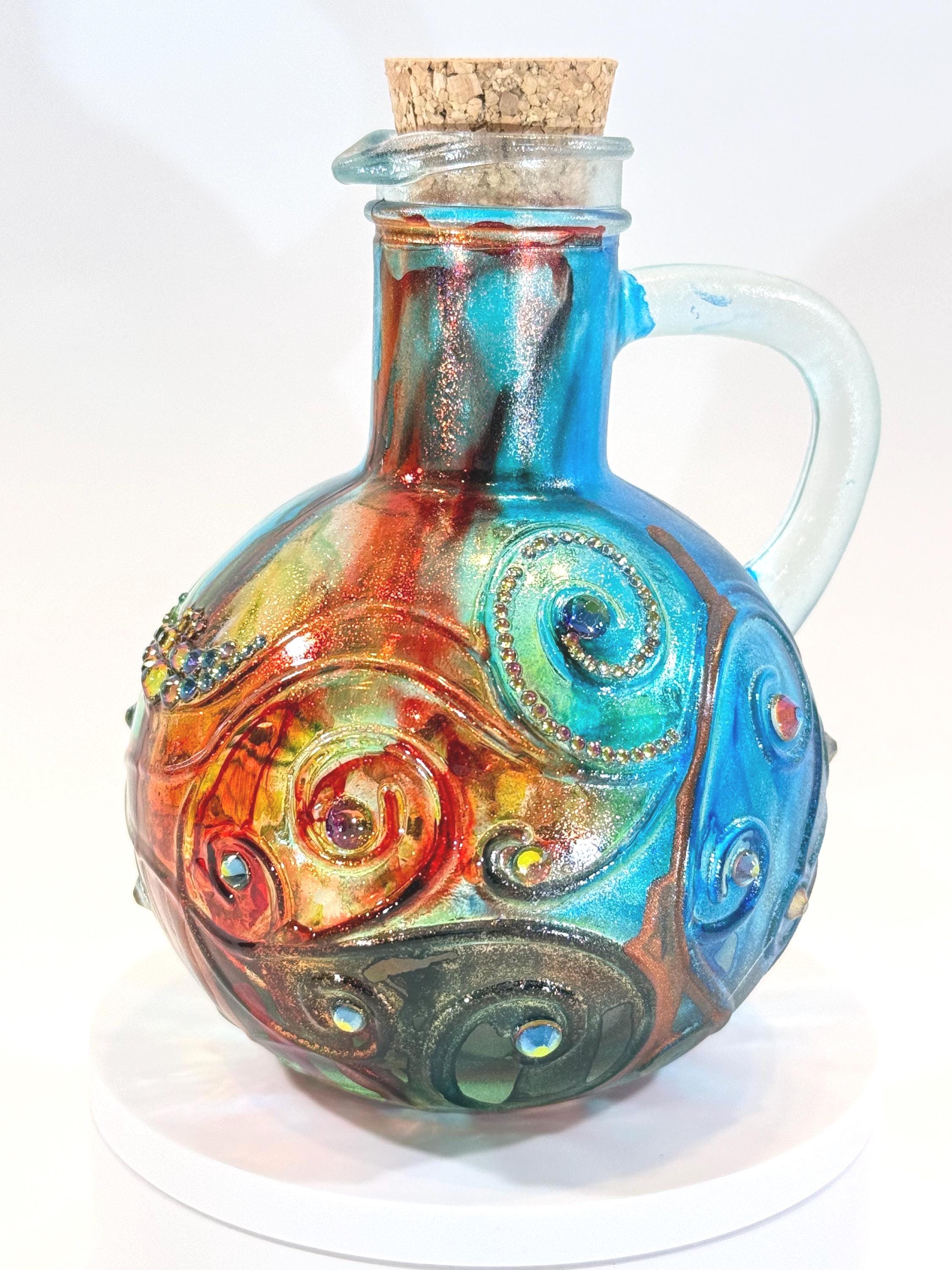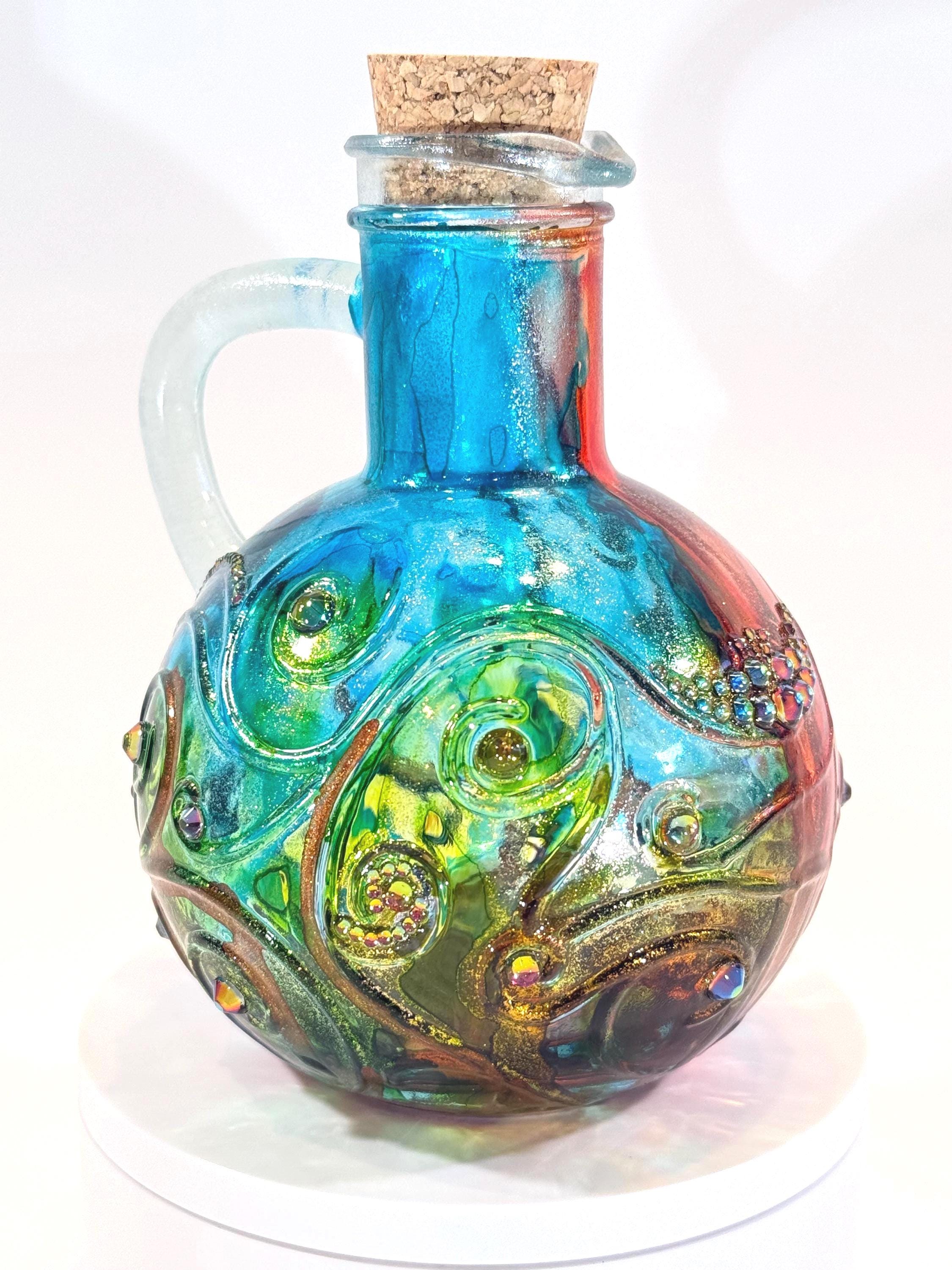 Small, but mighty! A visit to Tuscany in the fall is wonderful, but if you can't get there, at least this hand-painted Spanish glass carafe in the colors of the region will make you feel like you're there. Blues, greens, and rust colors evoke the setting sun on a red tile roof. Swirling crystal accents will remind you of the stars twinkling in the Tuscan sky. Grab yourself some gelato and enjoy this fully-functional piece of art! Approximately 5 1/2" tall with cork. Ink and crystals on glass. All artworks are one-of-a-kind, signed by the artist, and come with a Certificate of Authenticity.