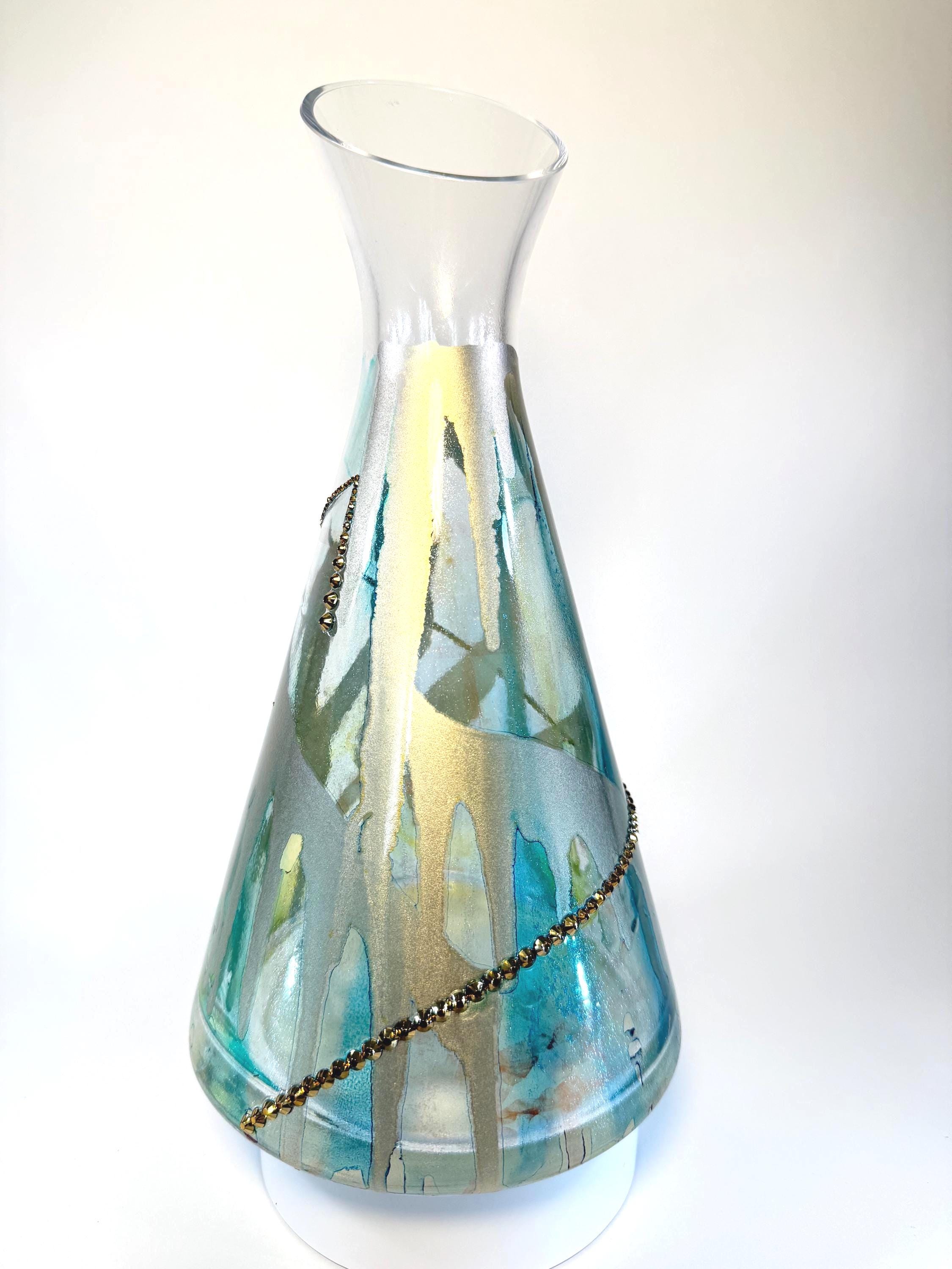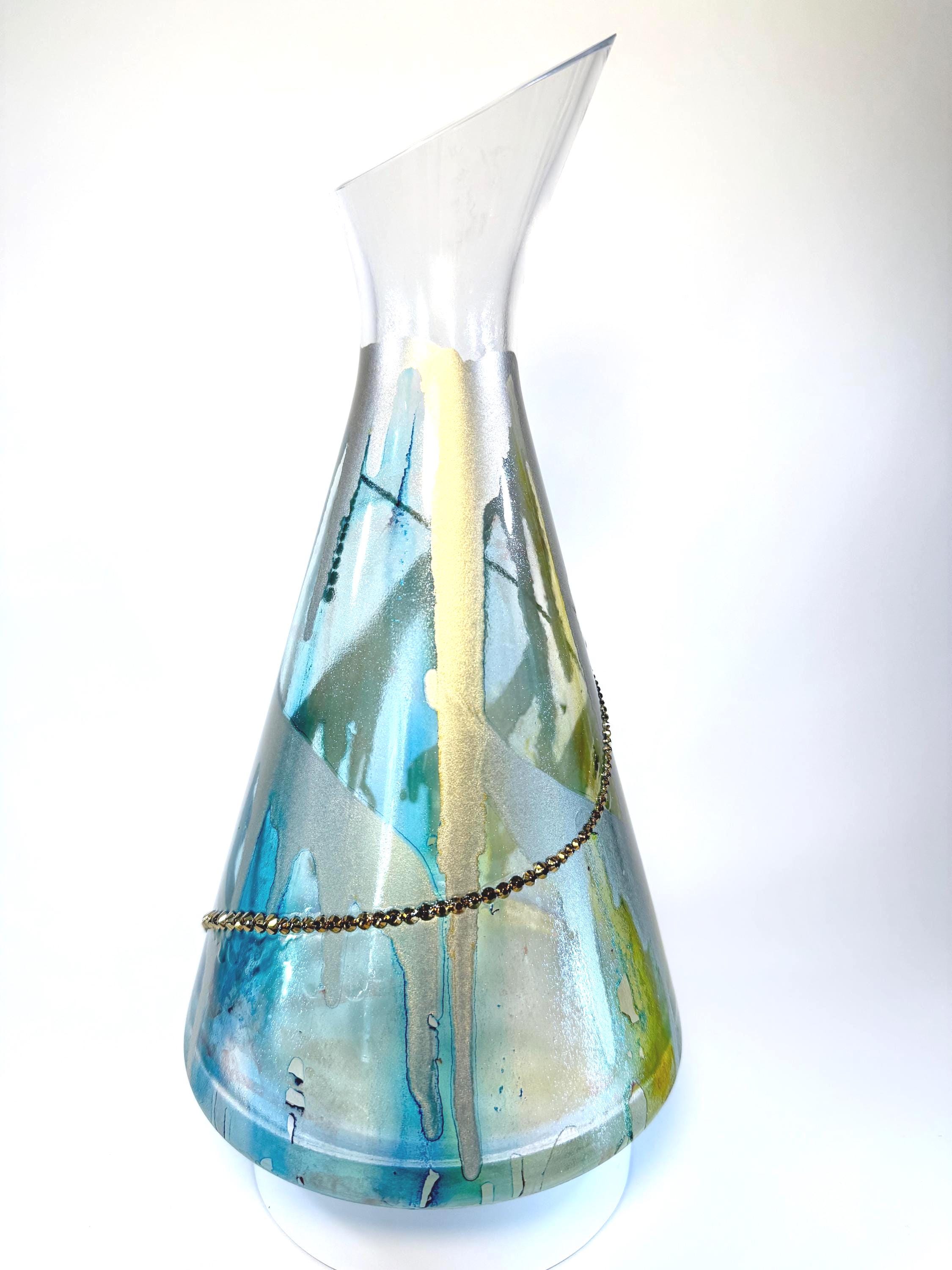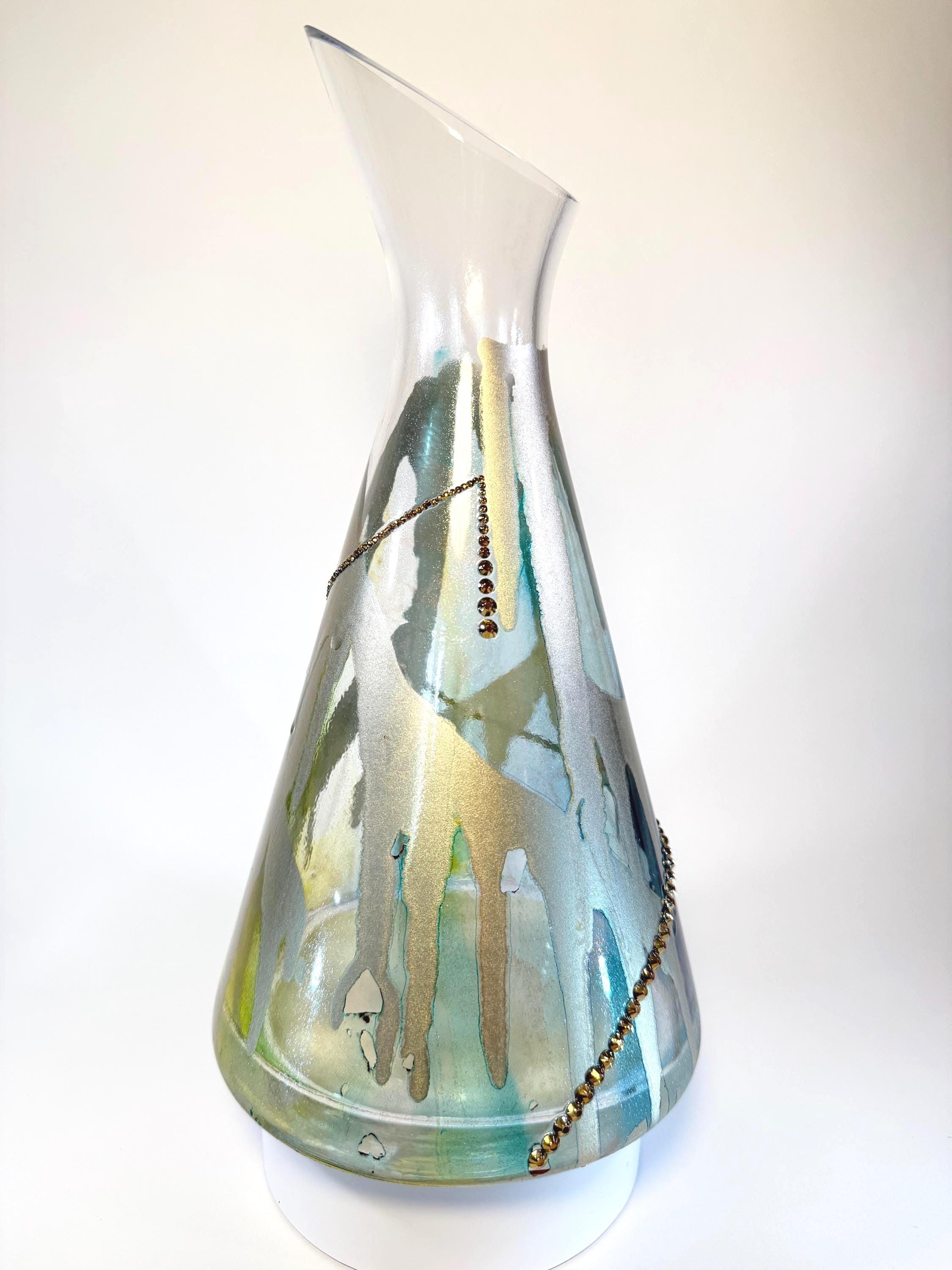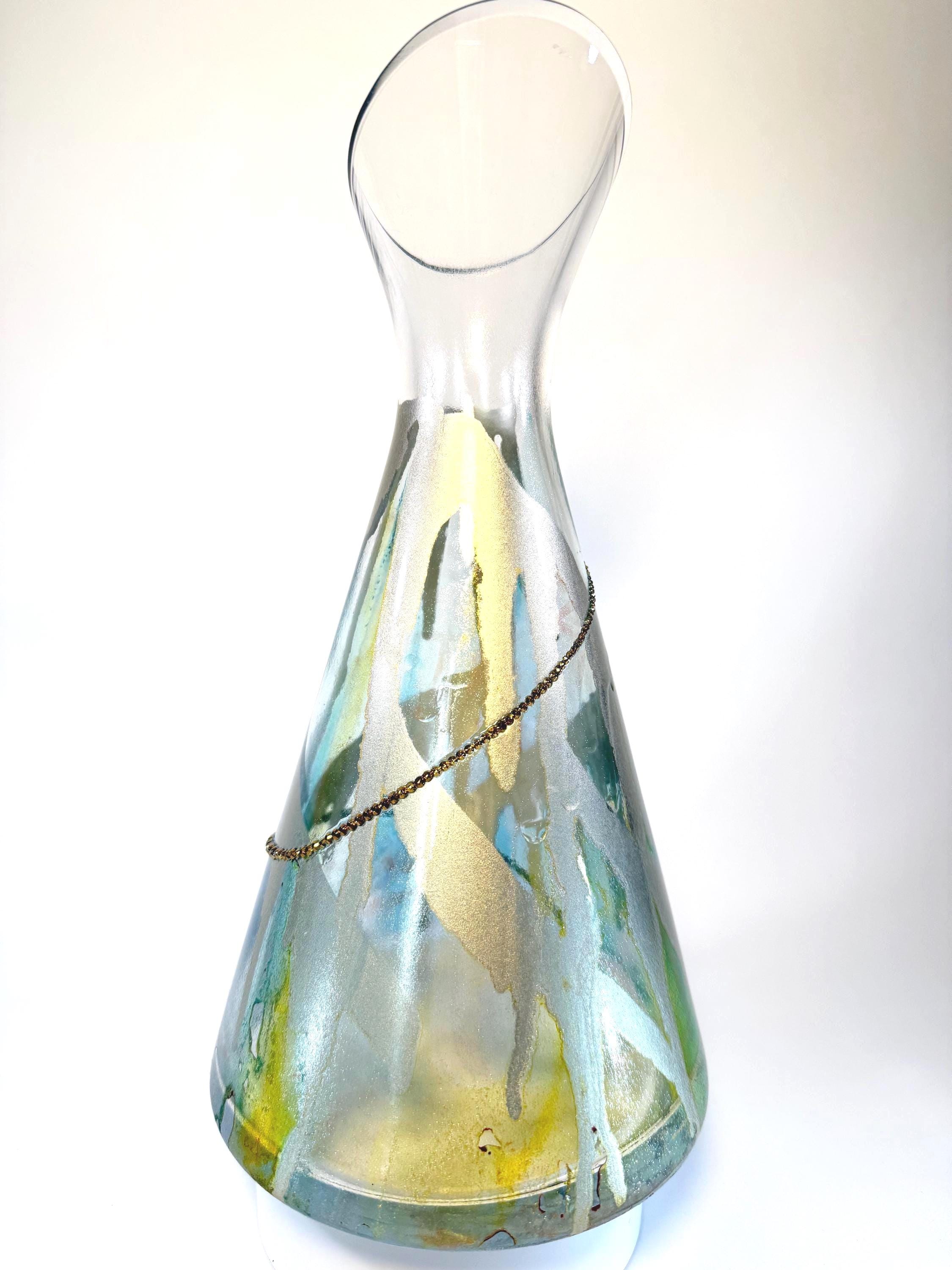 This Polish glass wine decanter is so unusual! An asymmetrical rim adds visual depth to this fully-functional decanter, painted in transparent hues of blue and green and offset with a dramatic gold swirl and opposing golden crystals. 11" tall at top of rim. Ink and crystals on glass. All artworks are one-of-a-kind, signed by the artist, and come with a Certificate of Authenticity.