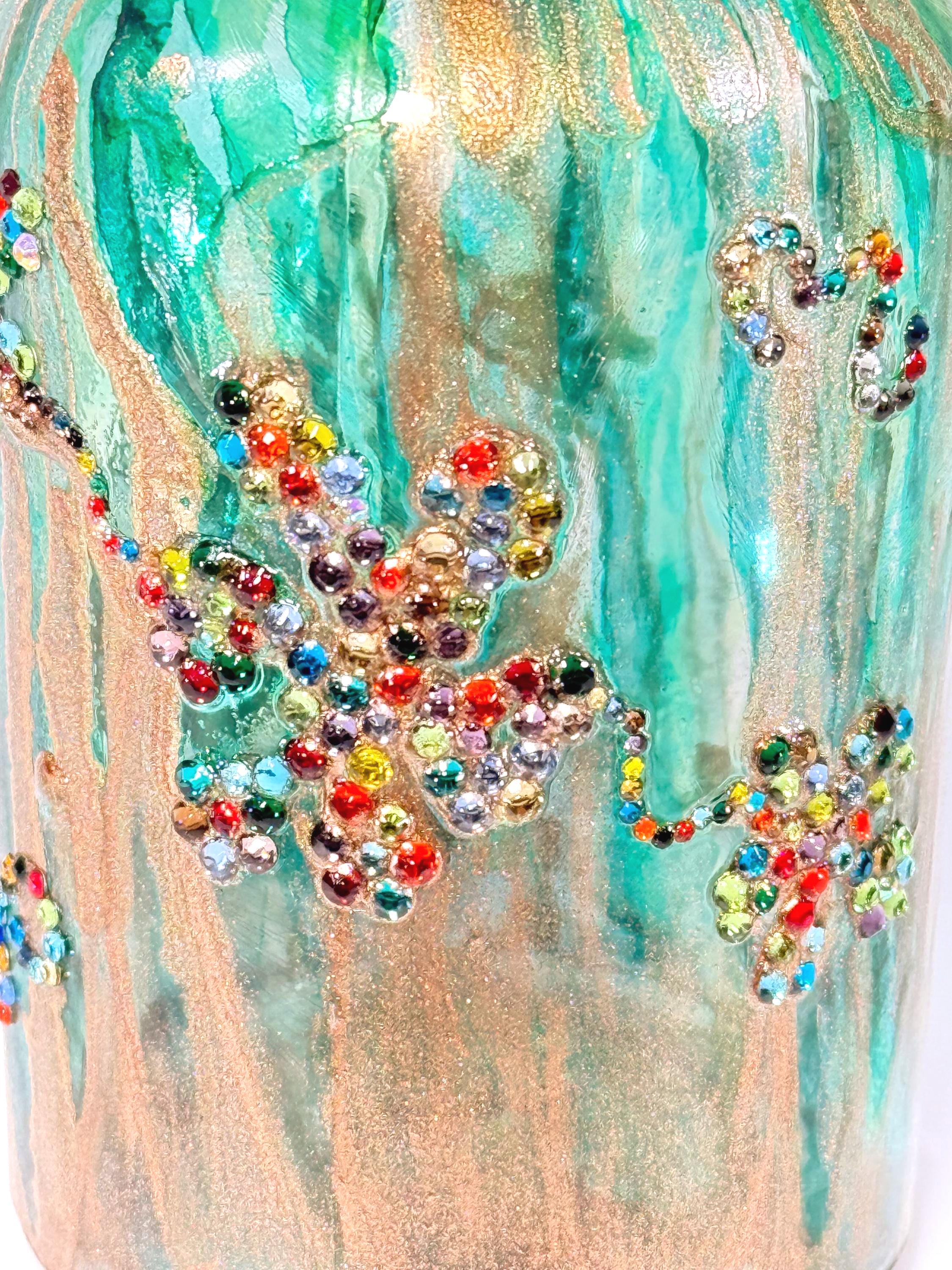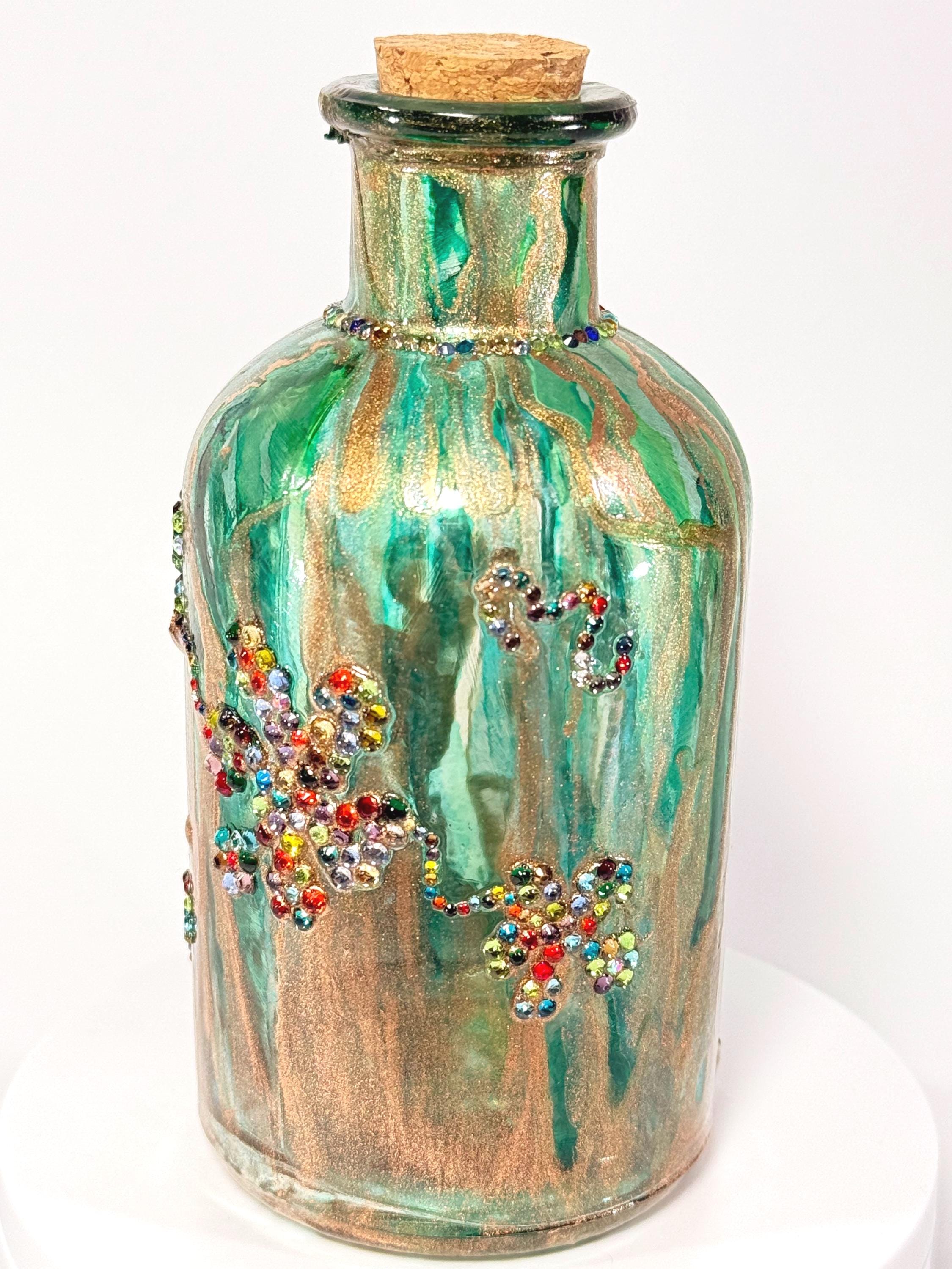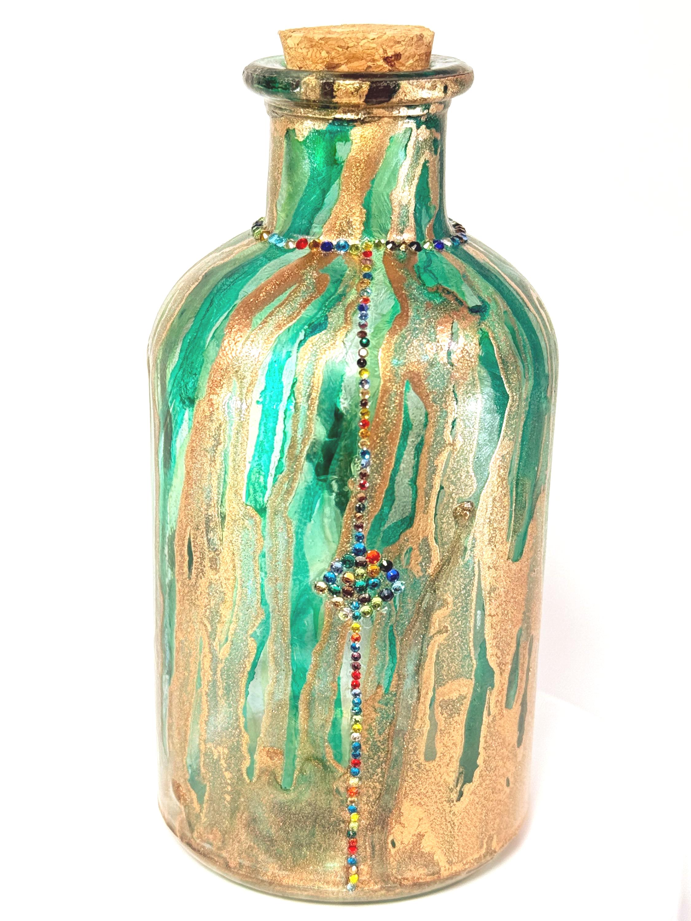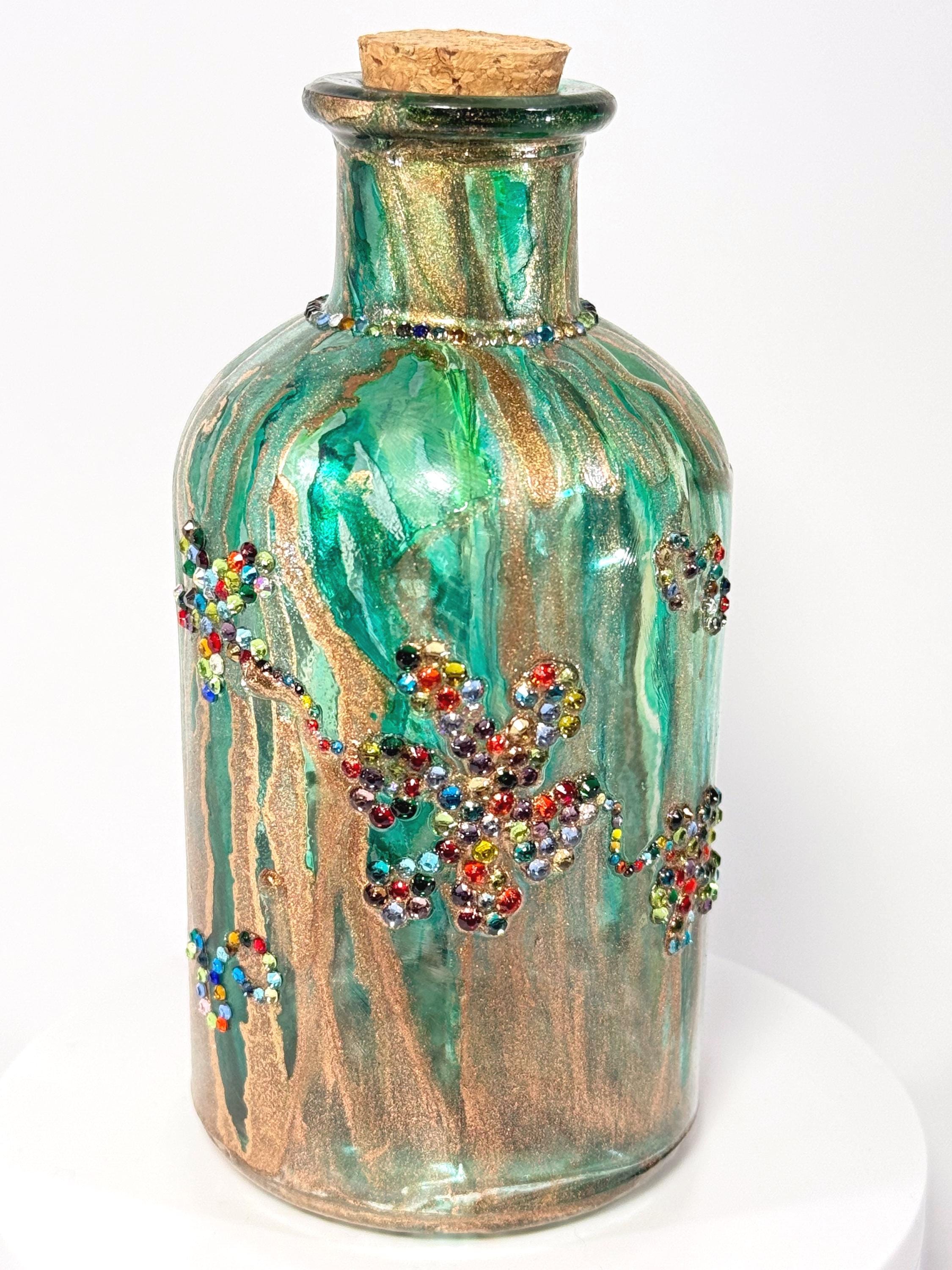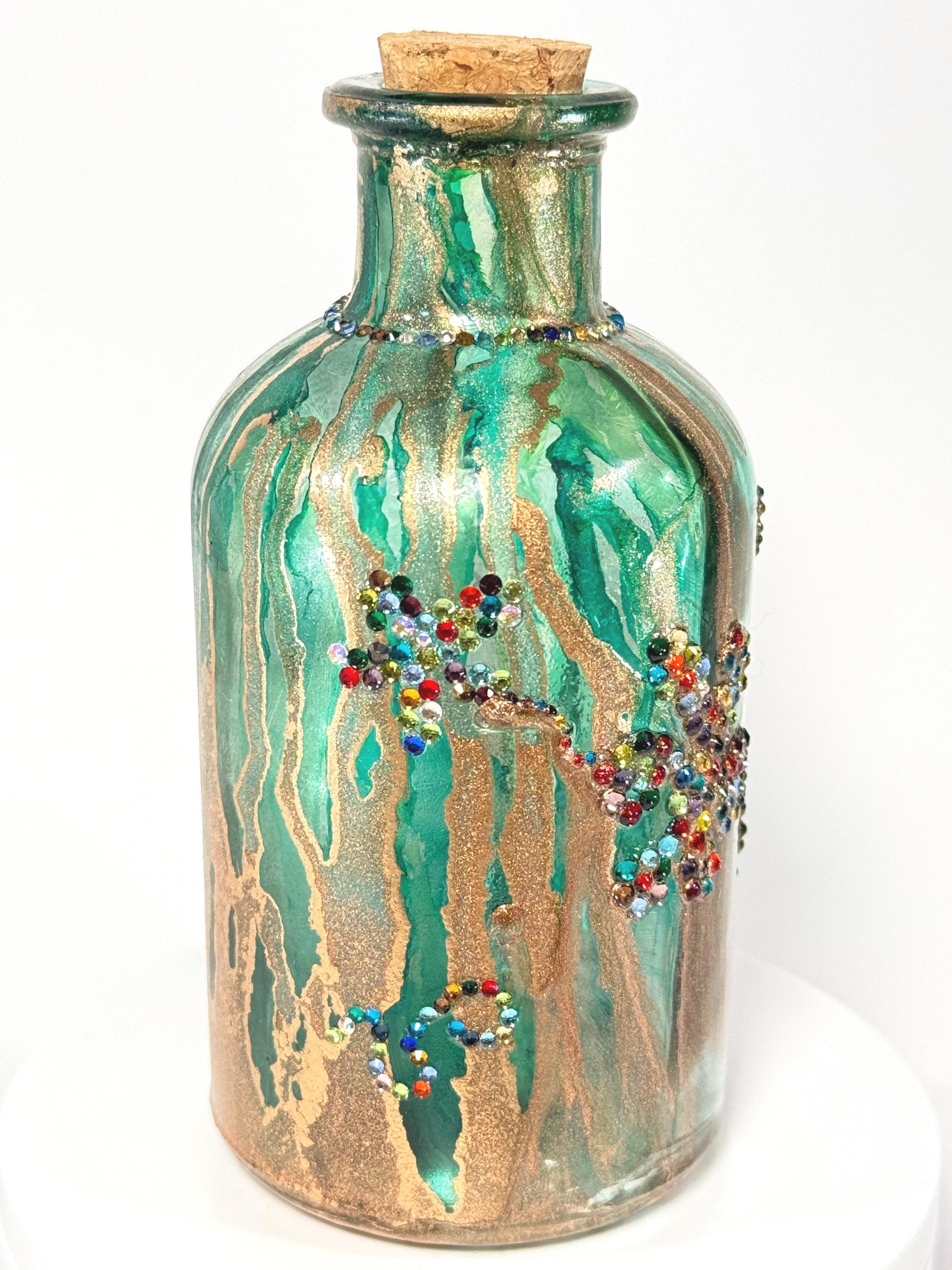 I don’t know about you, but I could use a little more peace in my life. This adorable little bottle just wants to hang out and be groovy. Perfect home decor or as a gift for that someone who has everything! 5" inches tall with cork. Ink and crystals on glass. All artworks are one-of-a-kind, signed by the artist, and come with a Certificate of Authenticity.