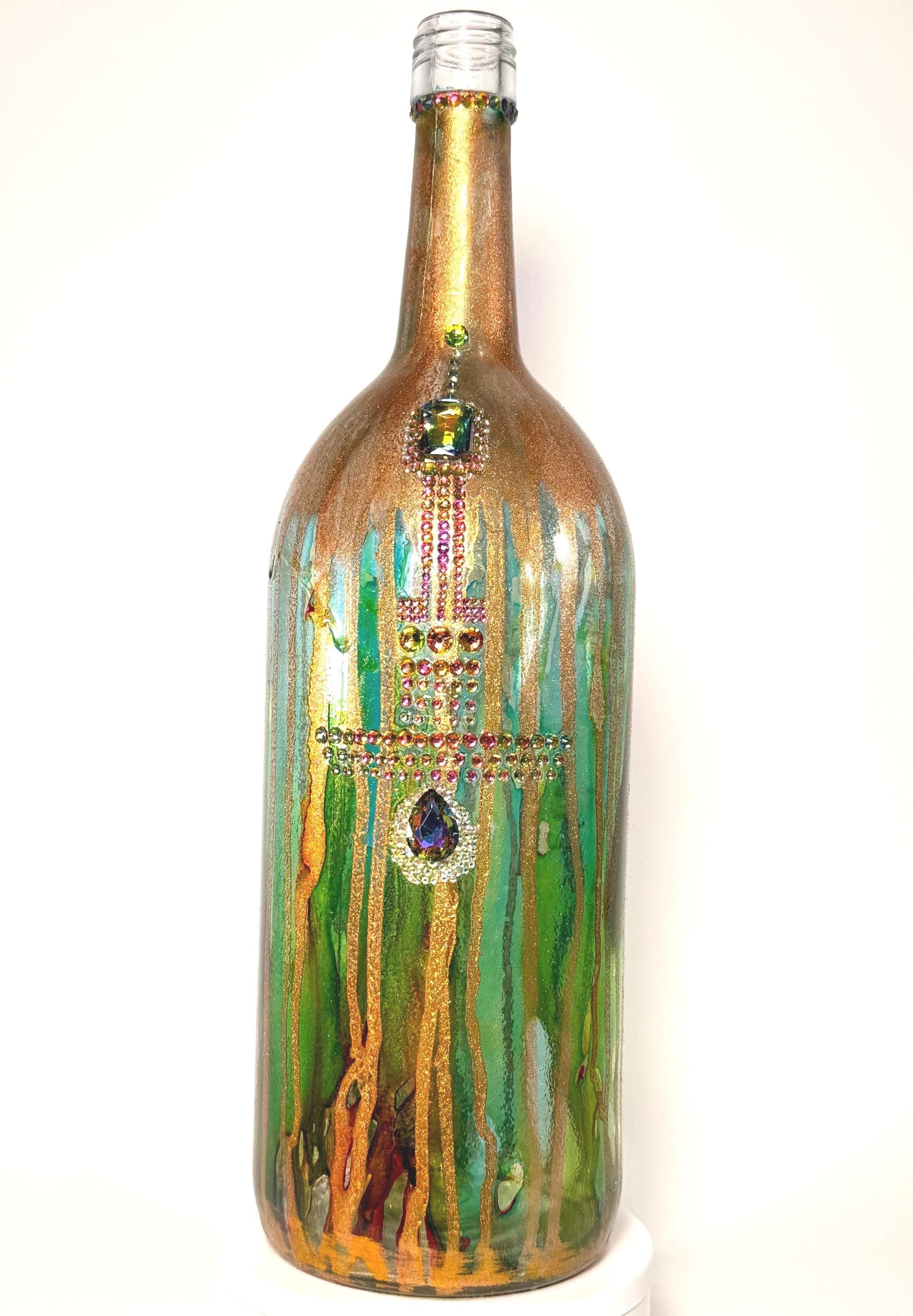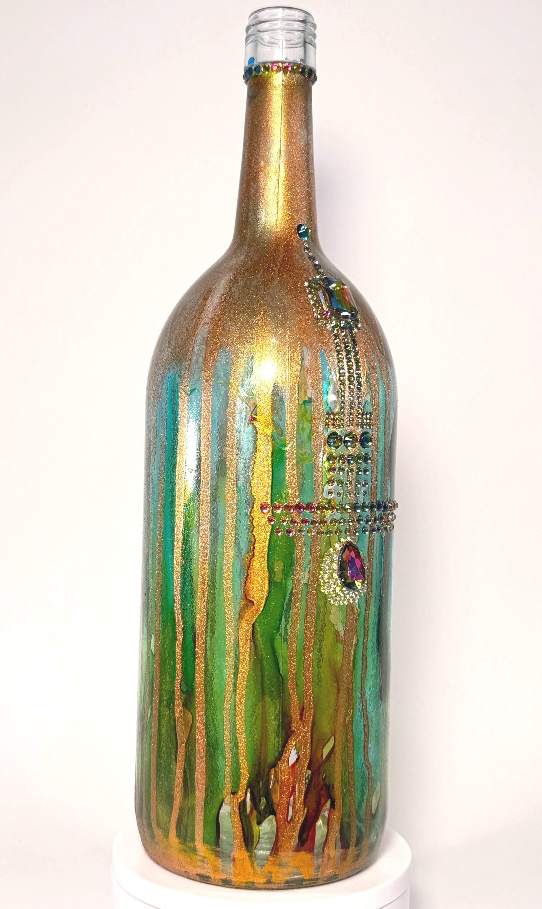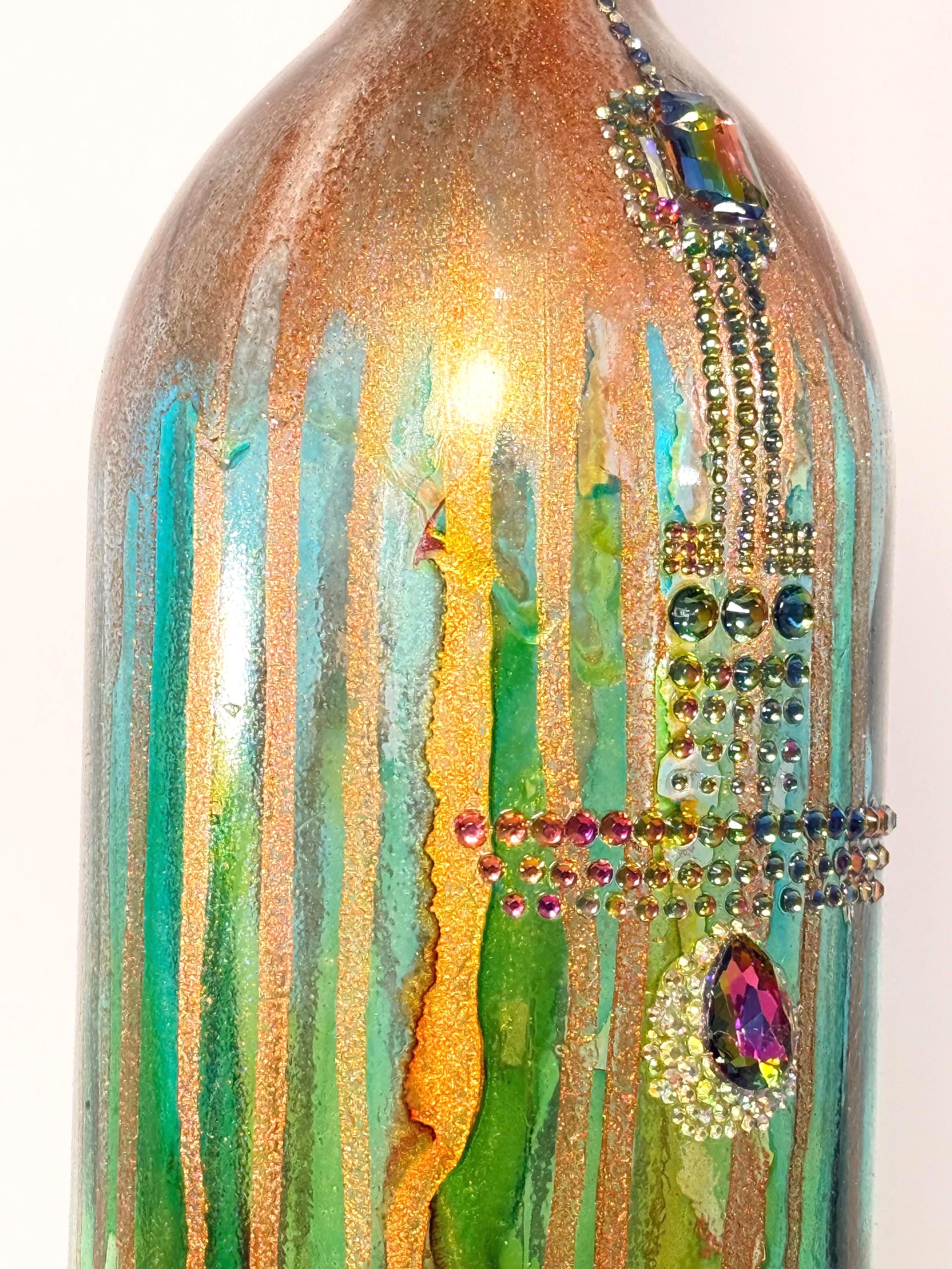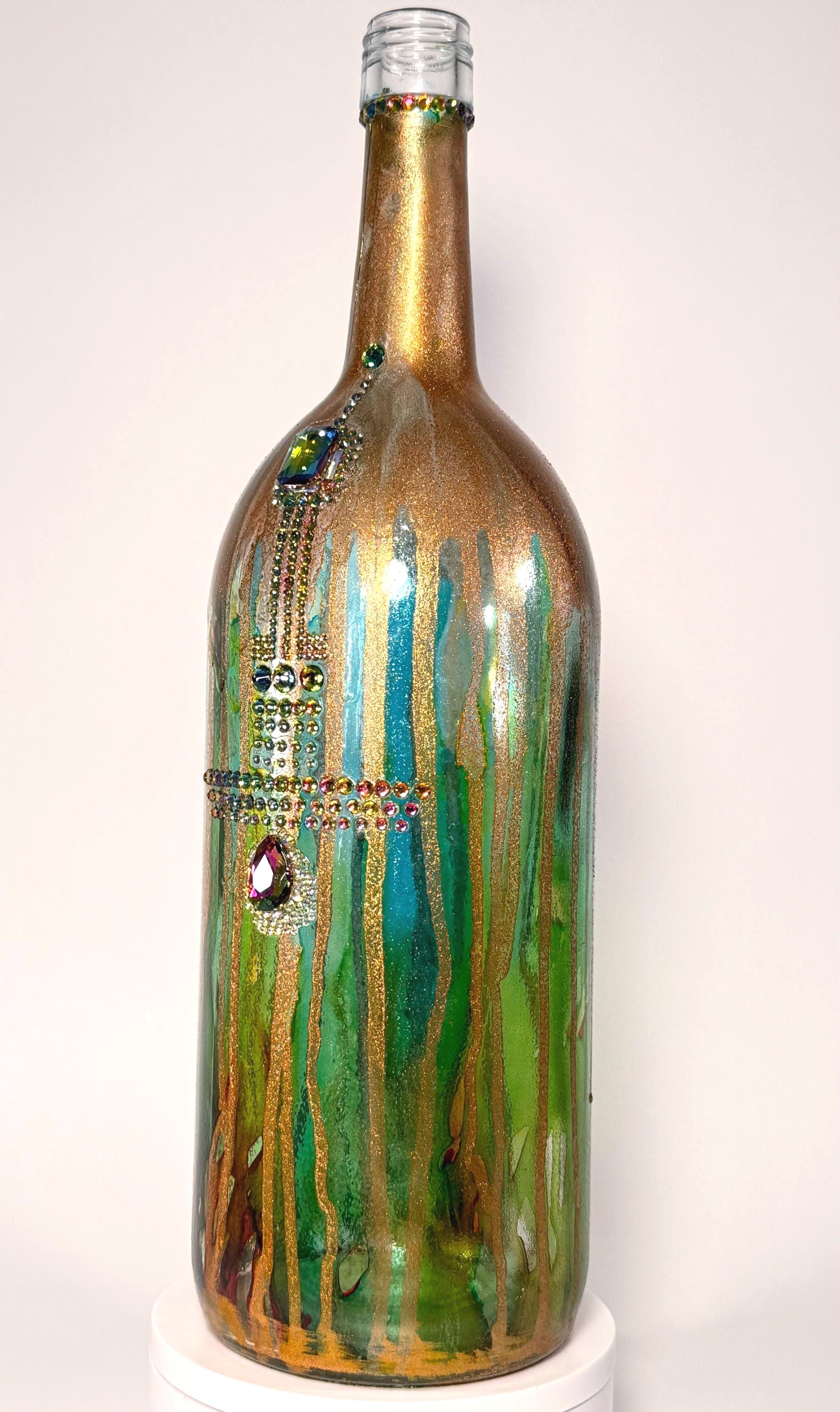This found object glass bottle is painted in shades of green, blue, and red, then drenched with a shimmering copper finish. The crystal imagery evokes the geometric patterns of Navajo art, seen through a filter of Art Deco style. Approximately 13" tall and 4” in diameter. Ink and crystals on glass. All artworks are one-of-a-kind, signed by the artist, and come with a Certificate of Authenticity.