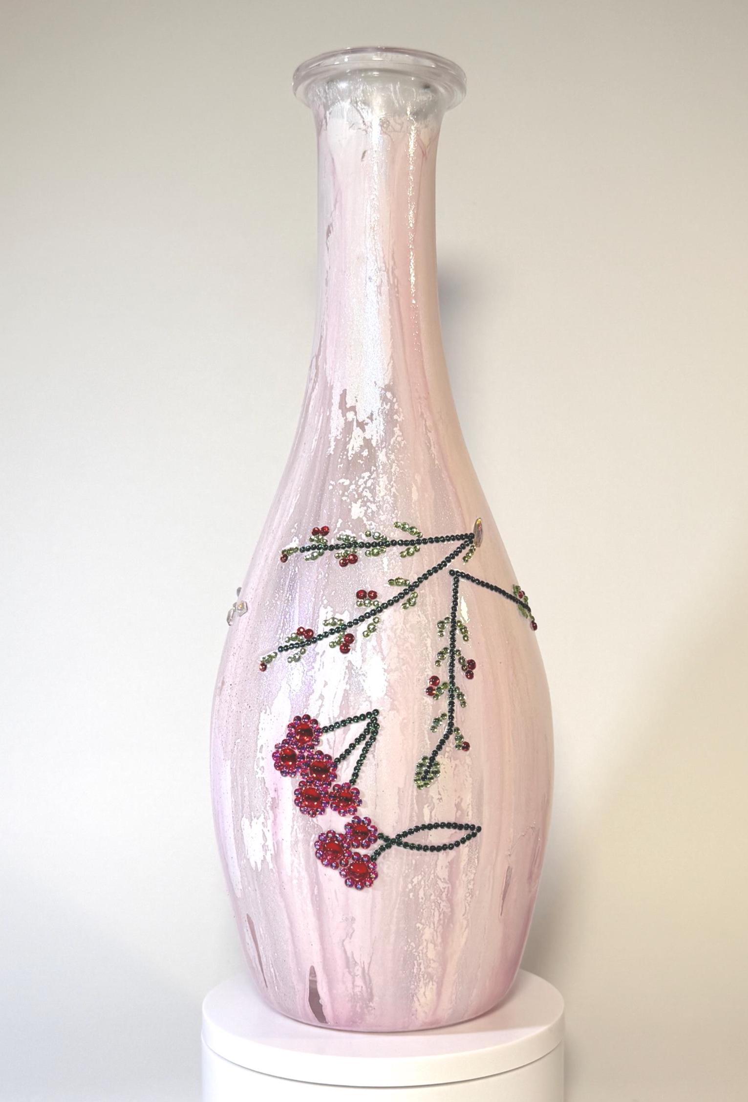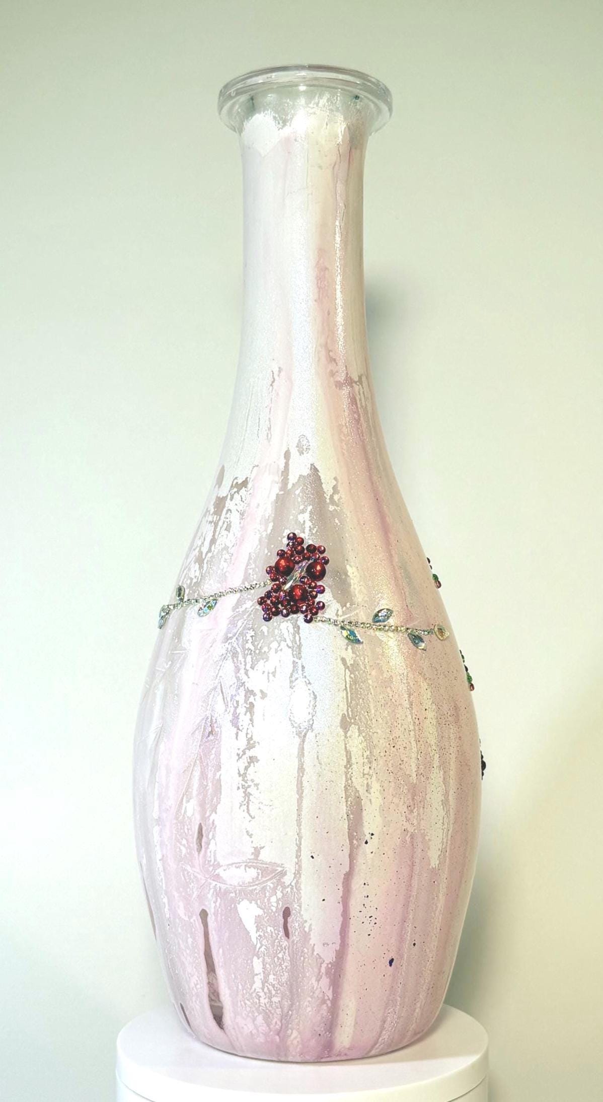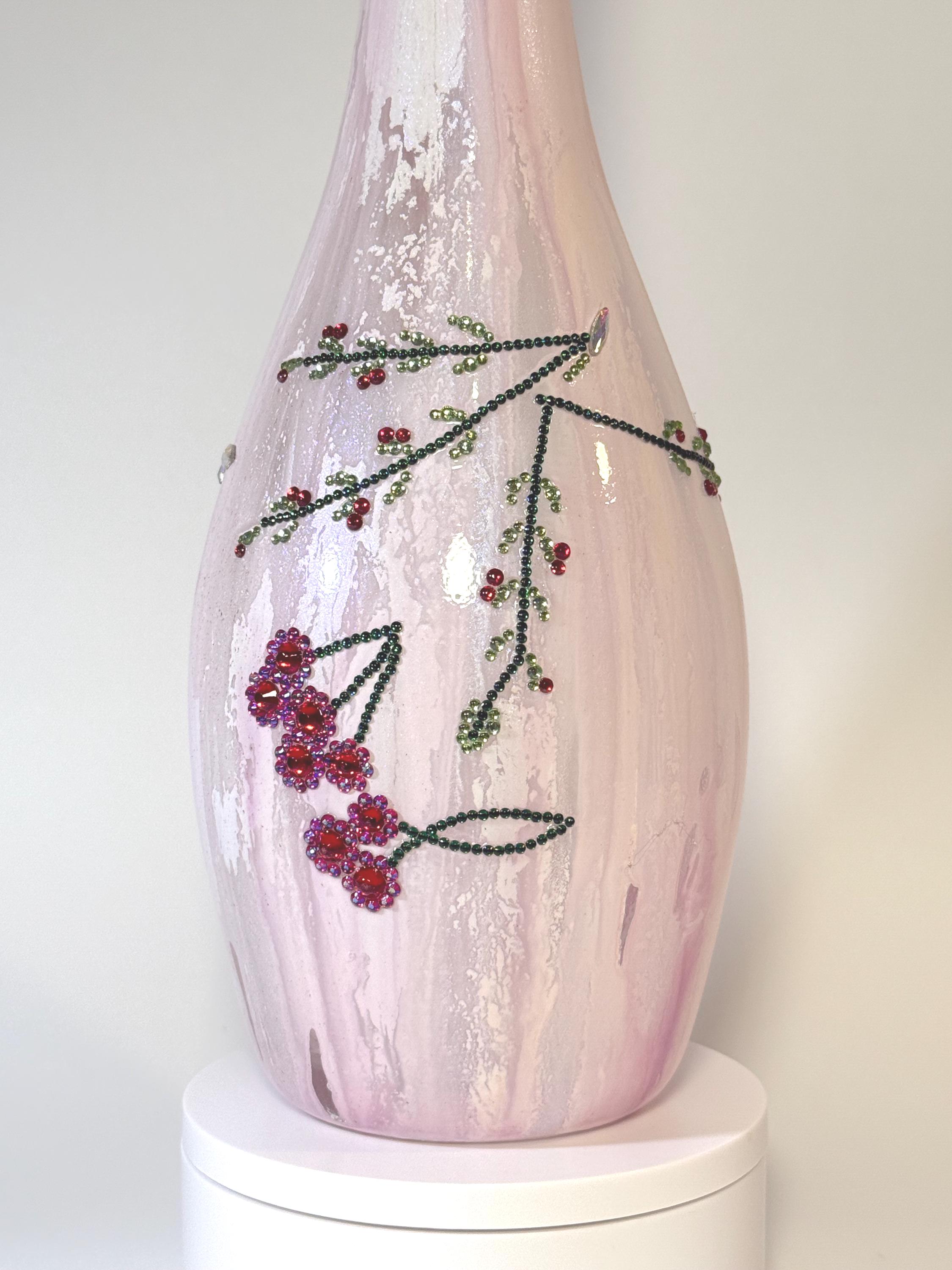 This lovely bottle in dusty pink stands 12" tall and is adorned with a sparkling cherry blossom motif in glittering crystals. Each side is different, so this art object will greatly benefit from display on a rotating stand. This one was a big hit at a recent art fair - snag it before someone else does! Ink and crystals on glass. All artworks are one-of-a-kind, signed by the artist, and come with a Certificate of Authenticity.